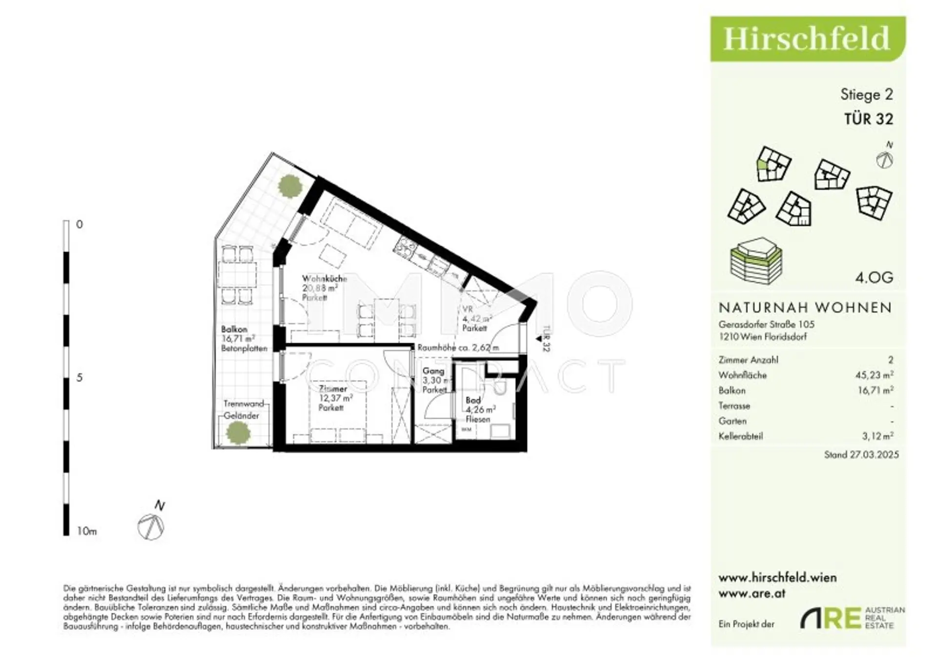 Hirschfeld ist ein beschauliches Viertel am Wiener Stadtrand. Die Metropole im Rücken verheißt jedem Nachhausekommen ein Naturerlebnis und Entspannung. Wer gerne mit den Wiener Linien unterwegs ist, nimmt am besten die Autobuslinie 32A ab Kollarzgasse bis zum U- und S-Bahn-Knotenpunkt Leopoldau. Von hier aus ermöglichen die U1 in Richtung Zentrum sowie die Schnellbahnlinien S1, S2 und S7 eine rasche Verbindung stadtein- und stadtauswärts. Alternativ verläuft die Straßenbahnlinie 31 entlang der Brünner Straße über Floridsdorf direkt bis Schottenring. Autofahrer profitieren von der nahegelegenen A22.