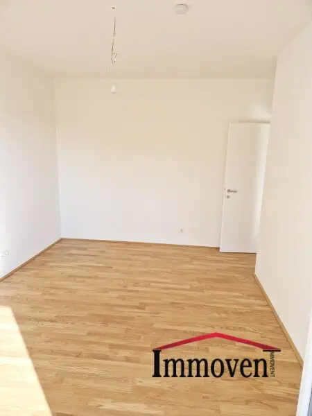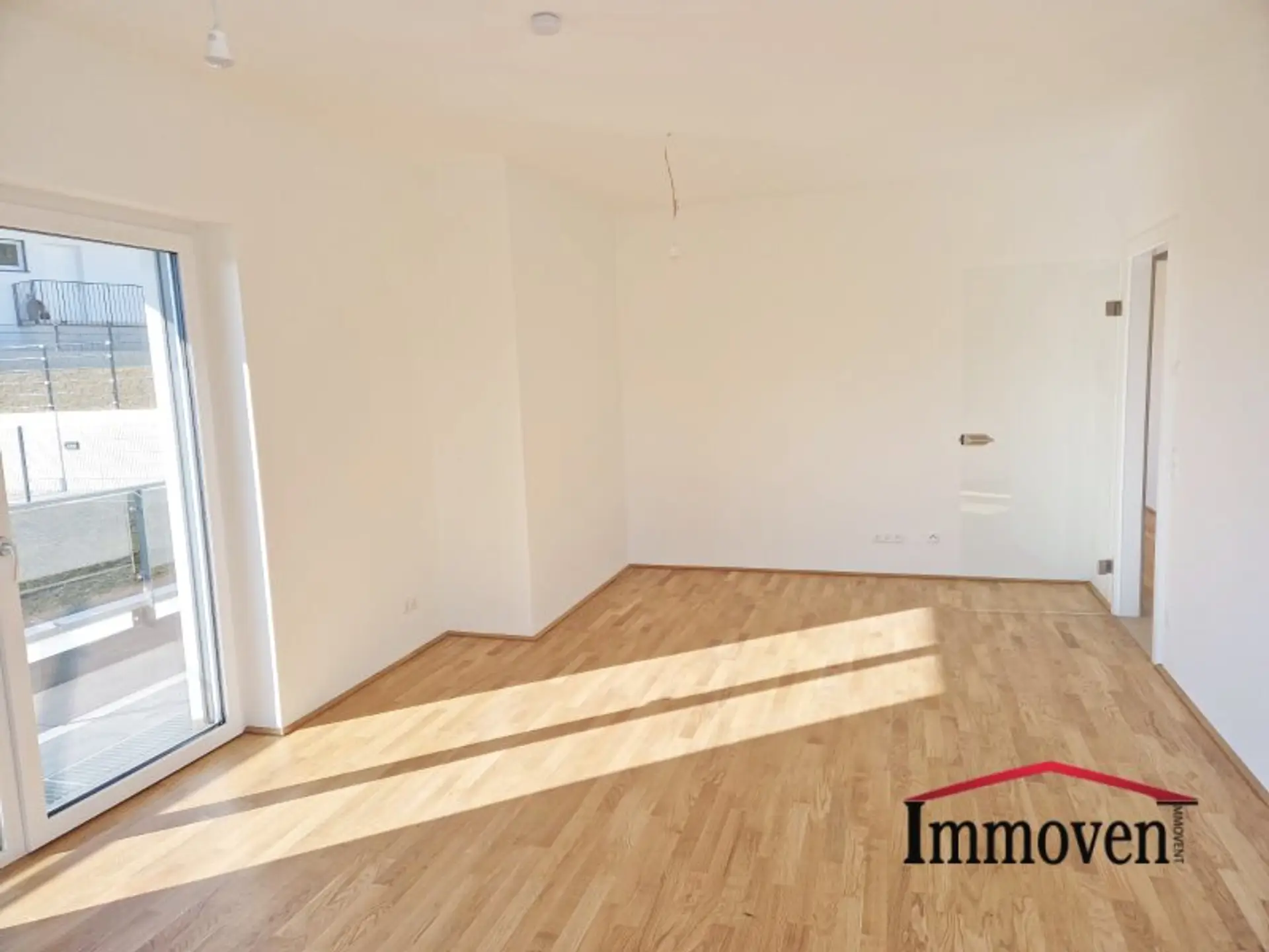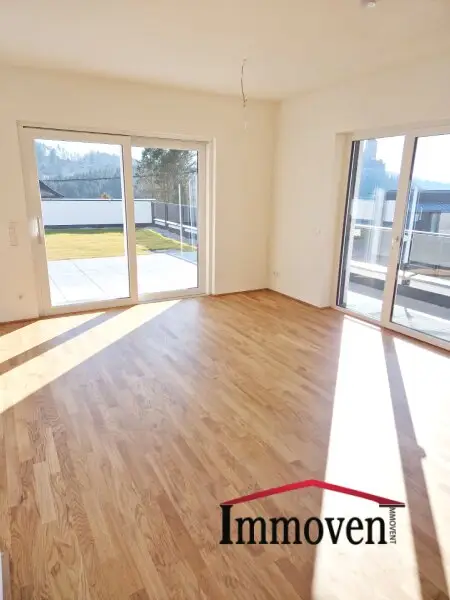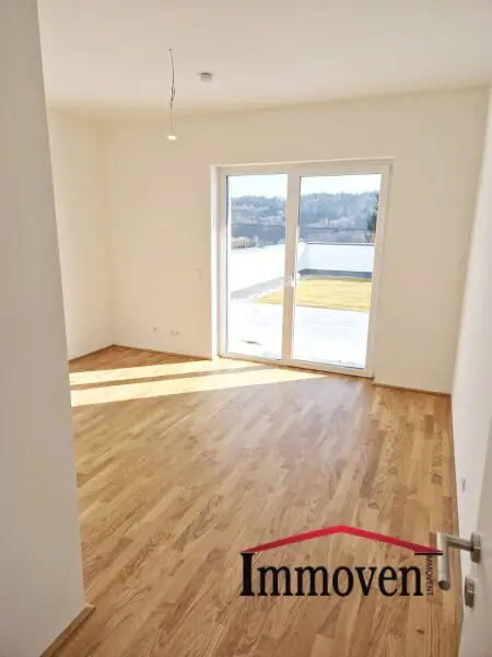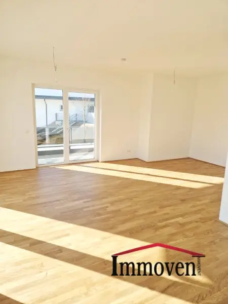 + Wohnraum mit offener Küche (es sind nur die Anschlüsse vorhanden) und Zugang auf die Terrasse, weiter auf die begrünte Terrasse und in den Garten