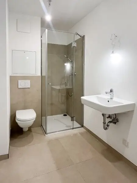Neben dem Eingangsbereich liegt das moderne Badezimmer mit fast 5 m² Größe, welches mit einer Duschkabine, einem Handwaschbecken mit einem Unterschrank sowie einem Spiegelschrank, einer Toilette und einem Waschmaschinen-Anschluss ausgestattet ist.