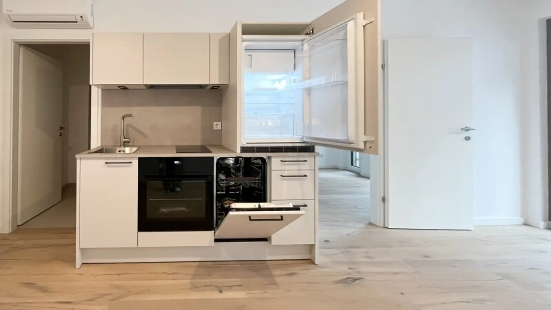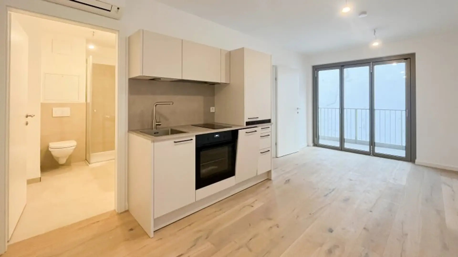 Nach dem Betreten der knapp 35 m² großen 2-Zimmer-Wohnung befindet man sich bereits in der Wohnküche mit etwa 20 m² Größe. Der Raum ist offen gestaltet und bietet viel Licht dank bodentiefen Fensterflächen und vorgelagertem Balkon. Hier lassen sich eine Couch und ein gemütlicher Essbereich wunderbar einrichten. Ein zeitloser Küchenblock mit Hängeschränken und sämtlichen Geräten ist selbstverständlich Teil der Ausstattung.