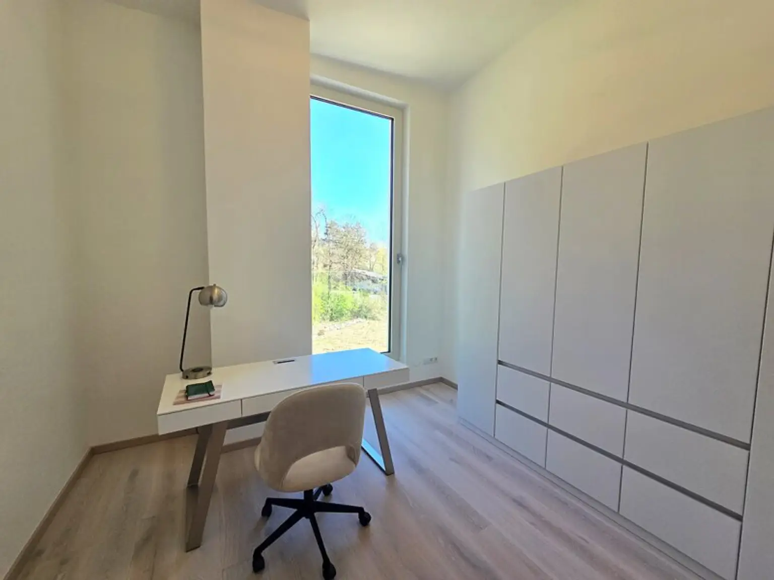 Im Obergeschoss befinden sich drei getrennt begehbare Zimmer, eine begehbare Garderobe, ein elegantes Badezimmer mit bodenebener Dusche und Doppelwaschbecken sowie ein separates WC.