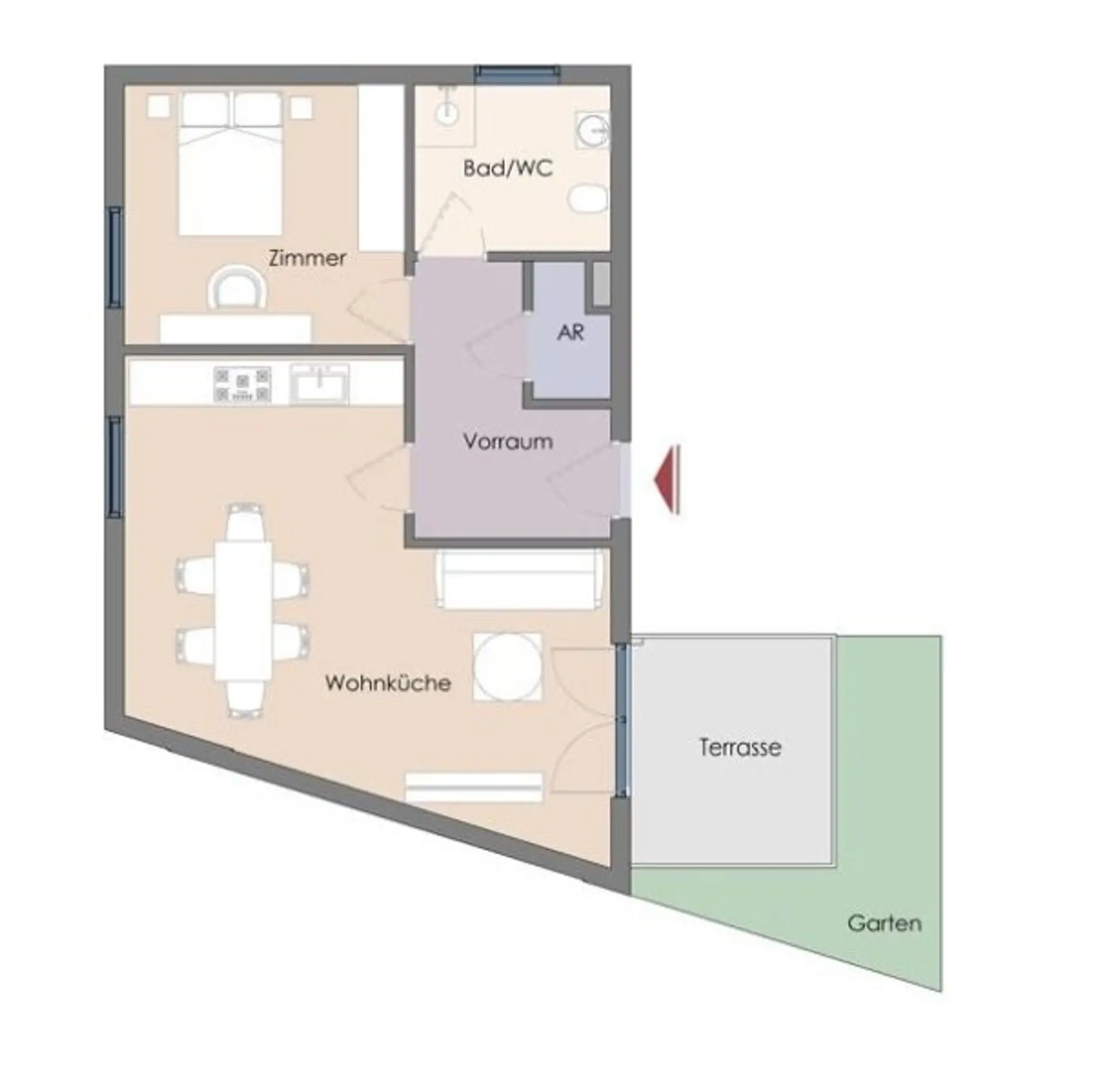 * Top 1: EG; 2 Zimmer; Wohnfläche: ca. 55m²; Garten + Terrasse: ca. 15,74m²