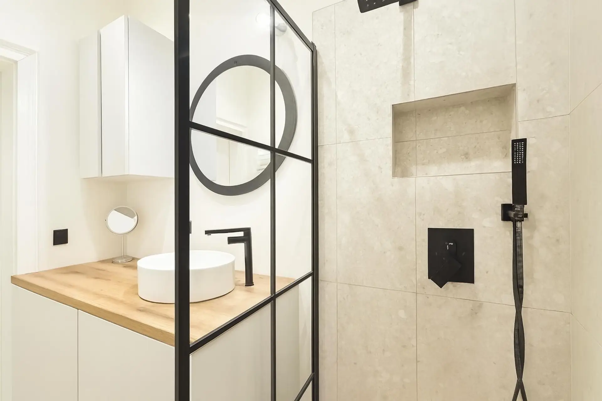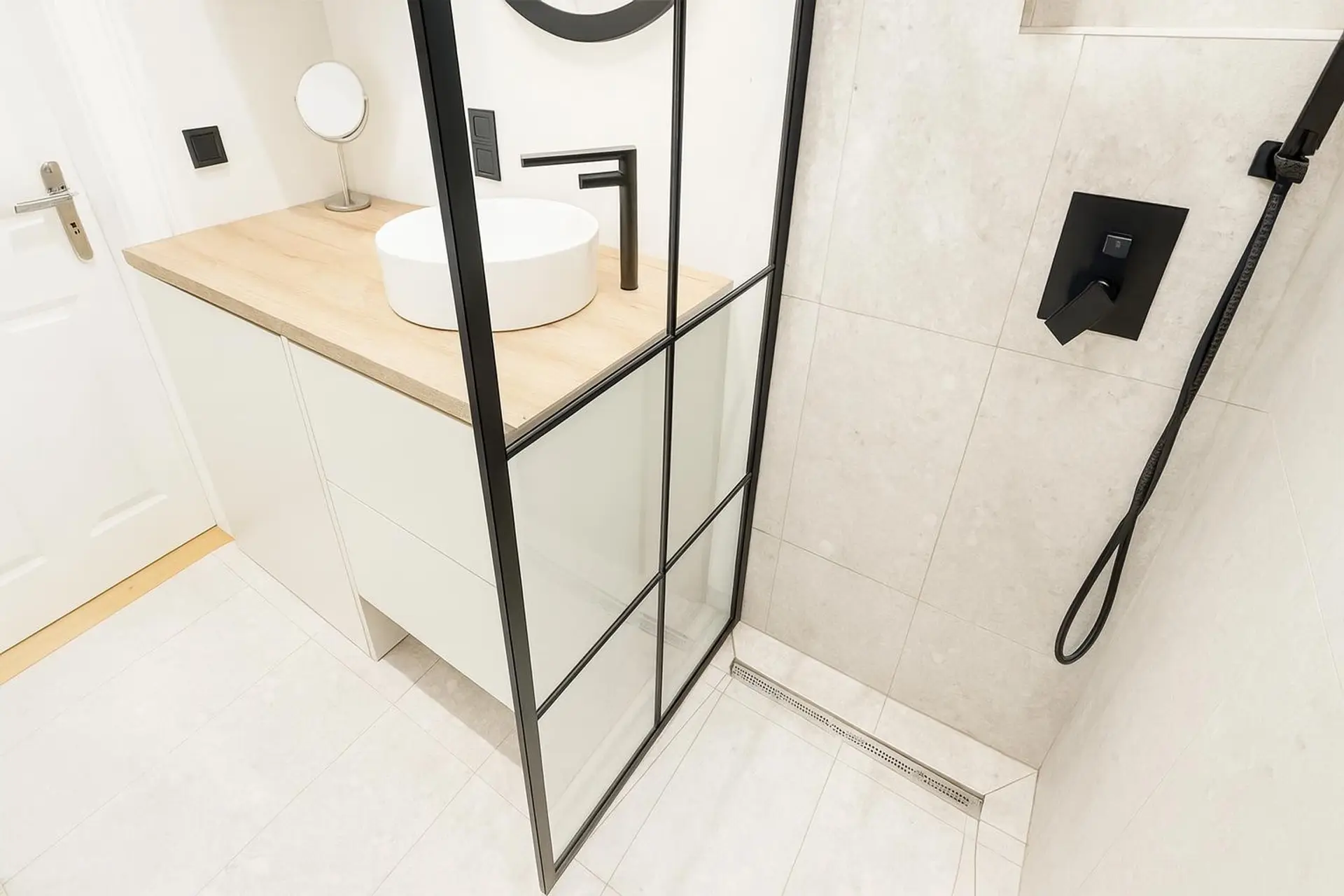 • Badezimmer mit Walk-In-Dusche, Waschtisch und Waschmaschine
