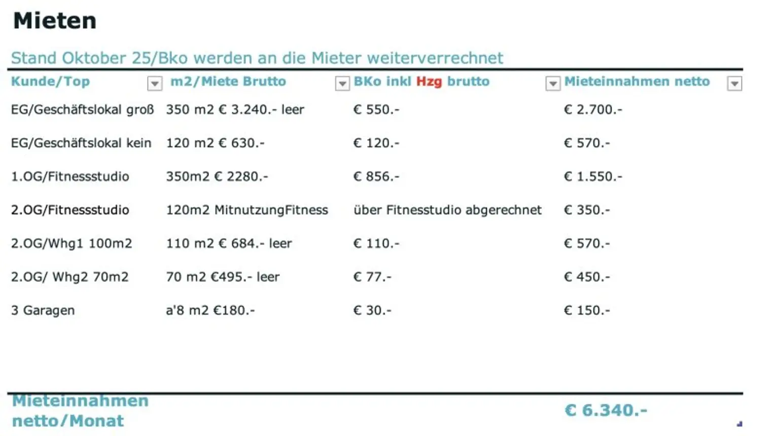 2 Geschäftsflächen und eine Wohnung sind derzeit langfristig vermietet, ein weiteres Geschäftslokal (ca. 350 m2, wird für Veranstaltungen von der Gemeinde Radenthein derzeit angemietet.
