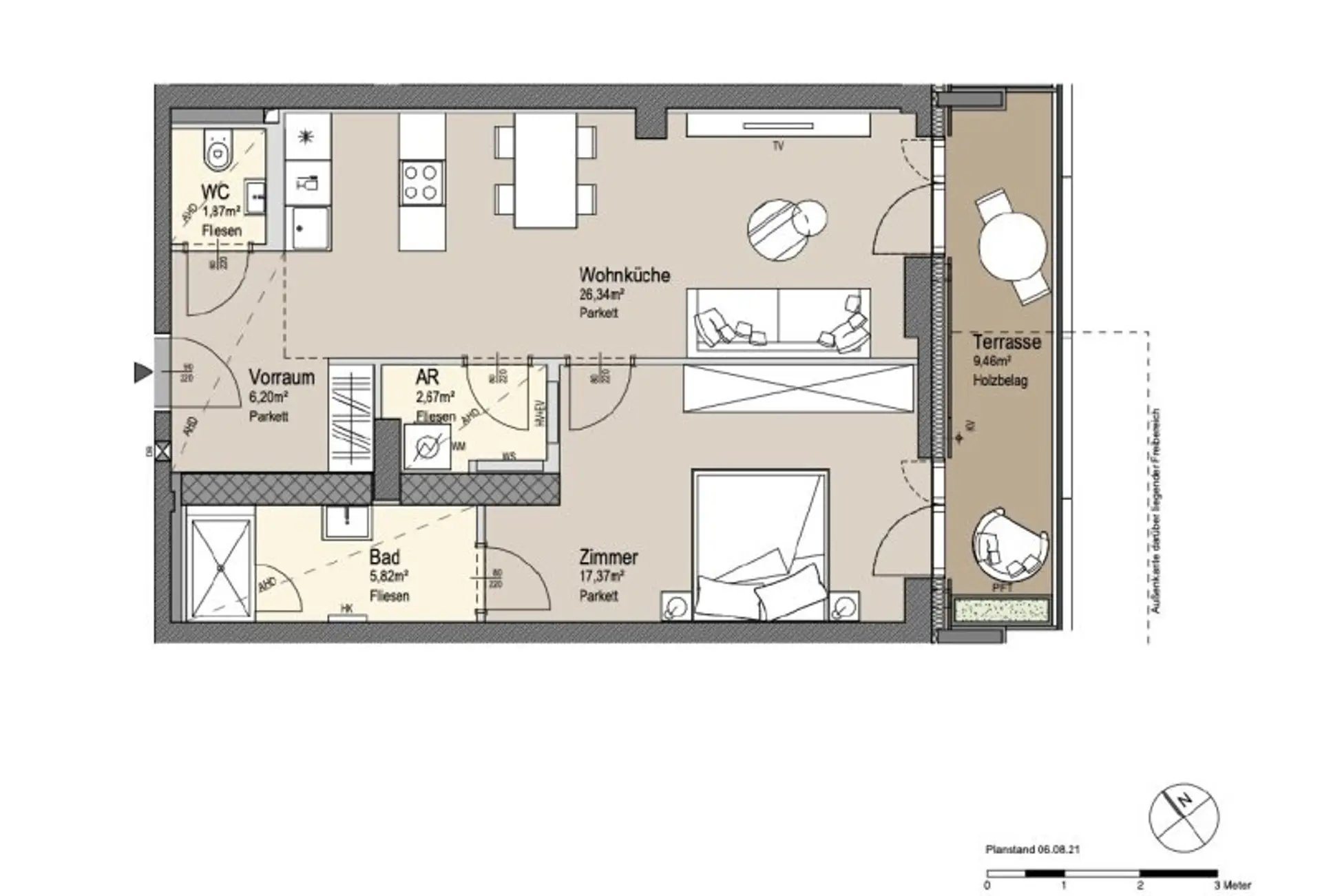 Die angebotene Wohnung liegt im 1. Liftstock und besticht durch einem durchdachten Grundriss und offenen Charakter des Wohnzimmers mit Zugang zur 9,5m² großen Terrasse.