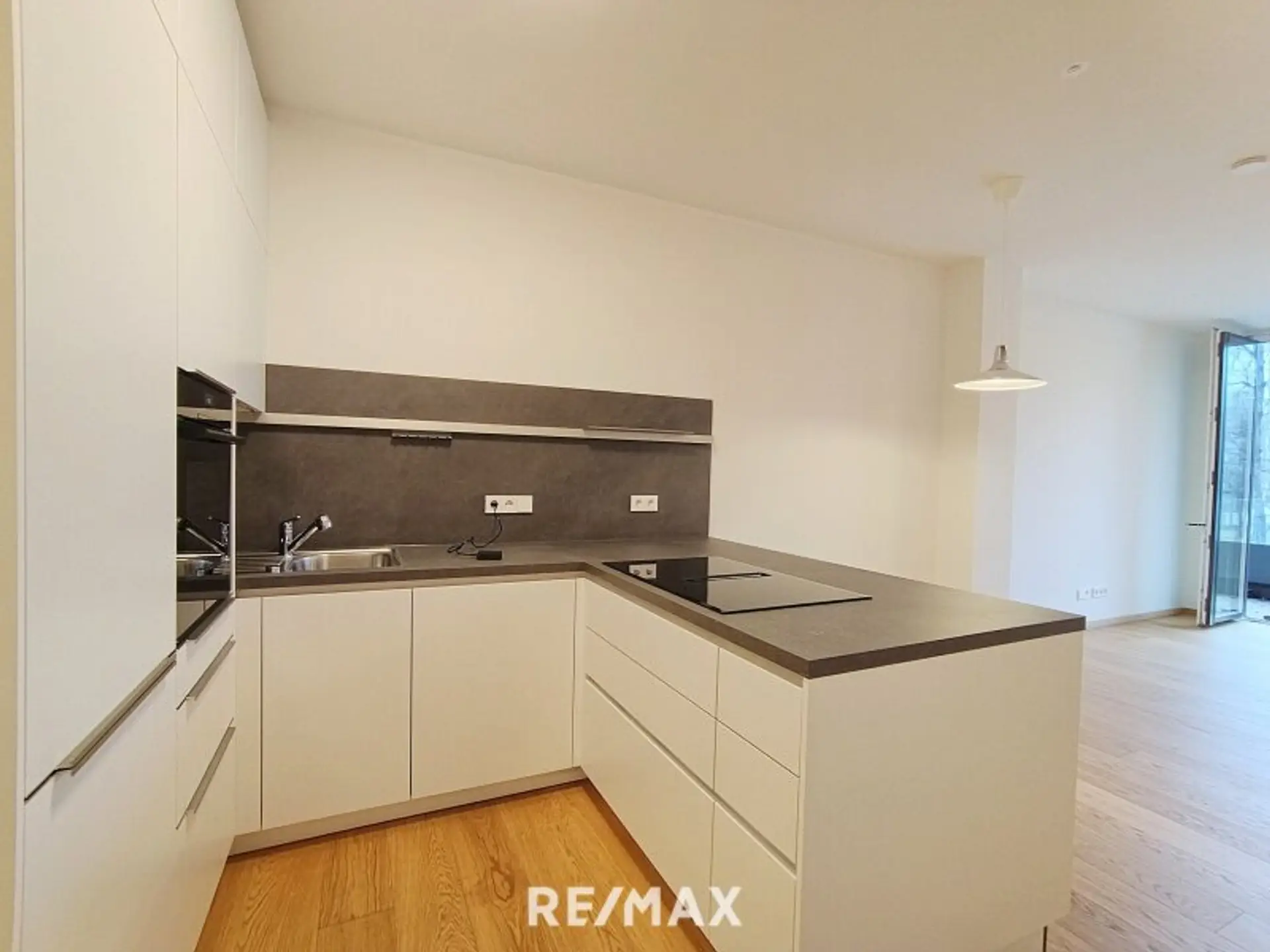 Die neue Designer Küche ist voll mit Markengeräten (Bosch) ausgestattet (Backofen inkl. Airfryer-Funktion, Geschirrspüler, Induktionskochfeld mit integriertem Dunstabzug, Blaupunkt Kühl-/Gefrierkombination), die bodentiefe Fenster verfügen über elektrische Jalousien.