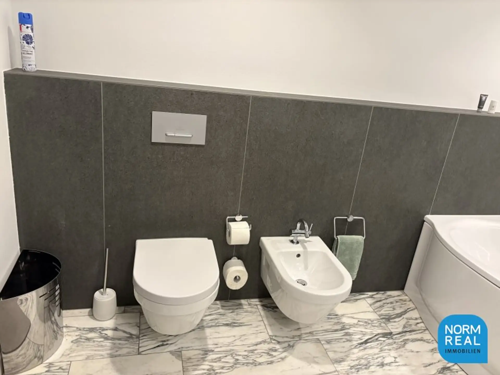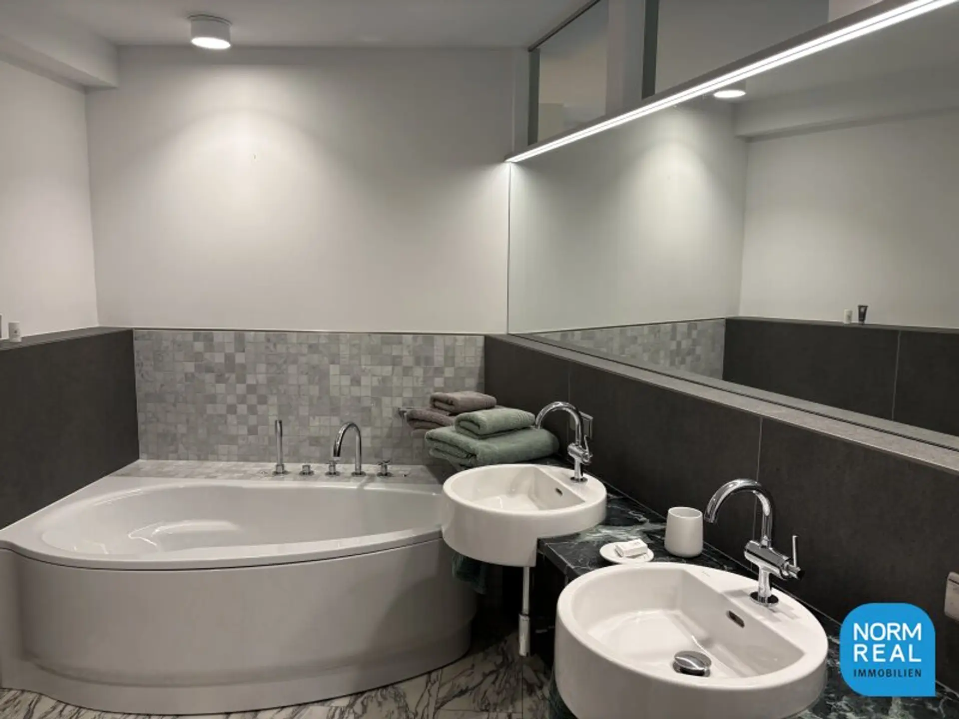 1 Schlafzimmer mit Zugang zum Bad mit Dusche Doppelwaschtisch, Badewanne und Dusche
