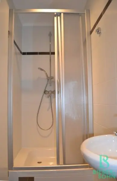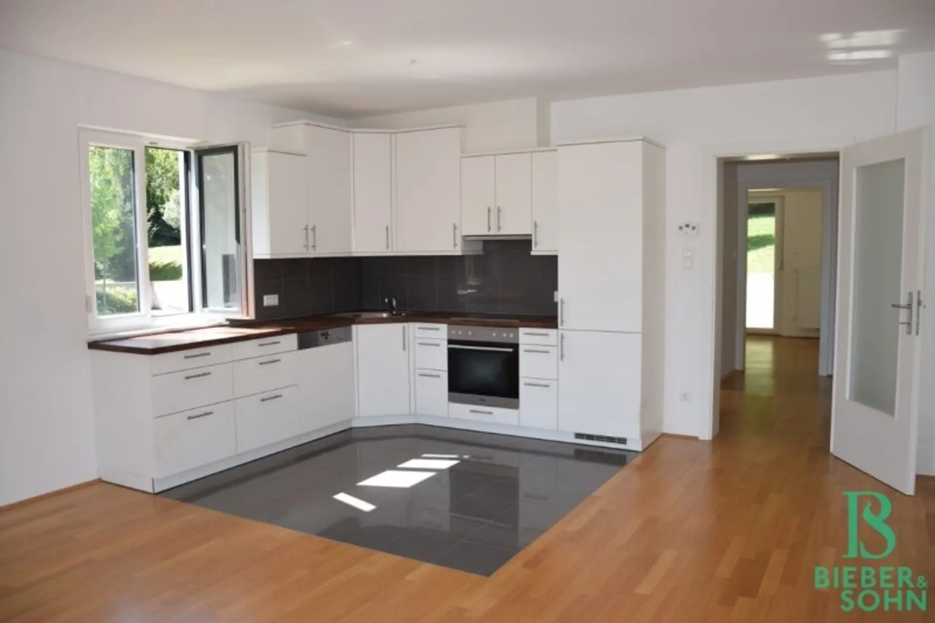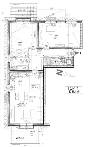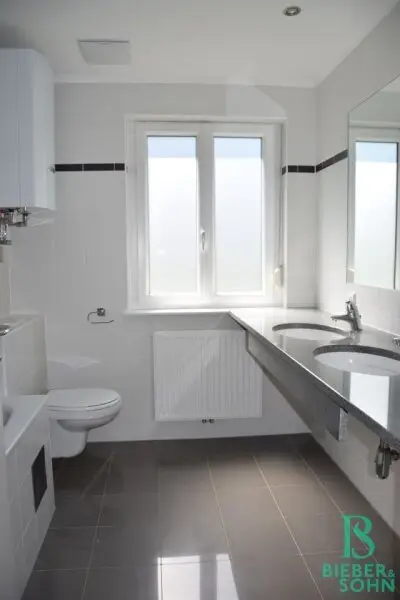 Im Erdgeschoss befindet sich diese ca. 85m² große 3-Zimmerwohnung mit 2 Terrassen. Über den Vorraum sind alle Räume getrennt zu begehen. Das große, helle und sonnige Wohnzimmer mit eleganter Küche und Ausgang zur Ost-Terrasse, ein Bad mit Wanne, Doppelwaschtisch, WM-Anschluß, ein Zimmer mit Ausgang auf die West-Terrasse, ein weiteres Zimmer und ein Duschbad mit WC sind Bestandteil der Wohnung.