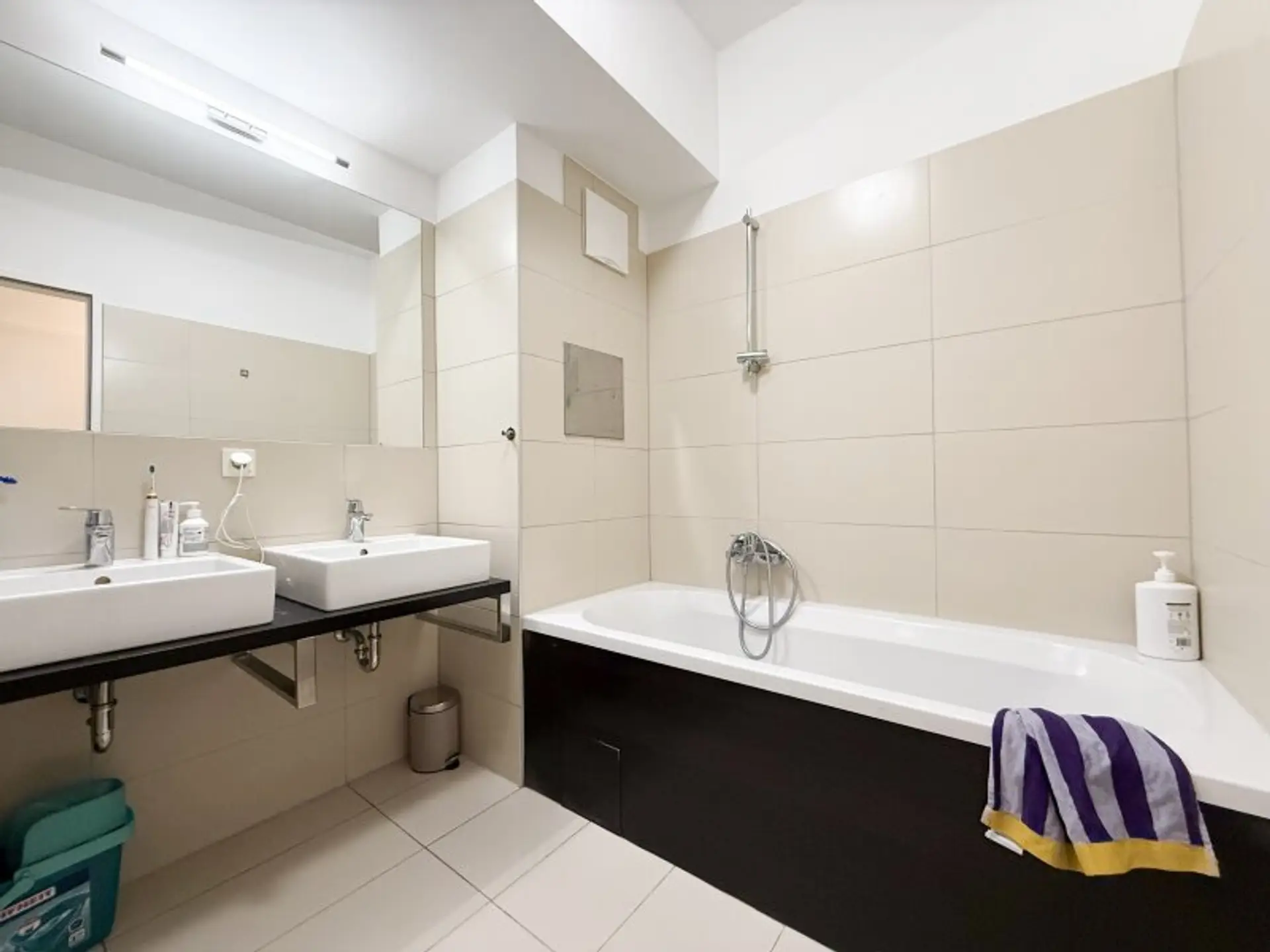 Badezimmer mit Badewanne, zwei Waschbecken und Waschmaschinenanschluss