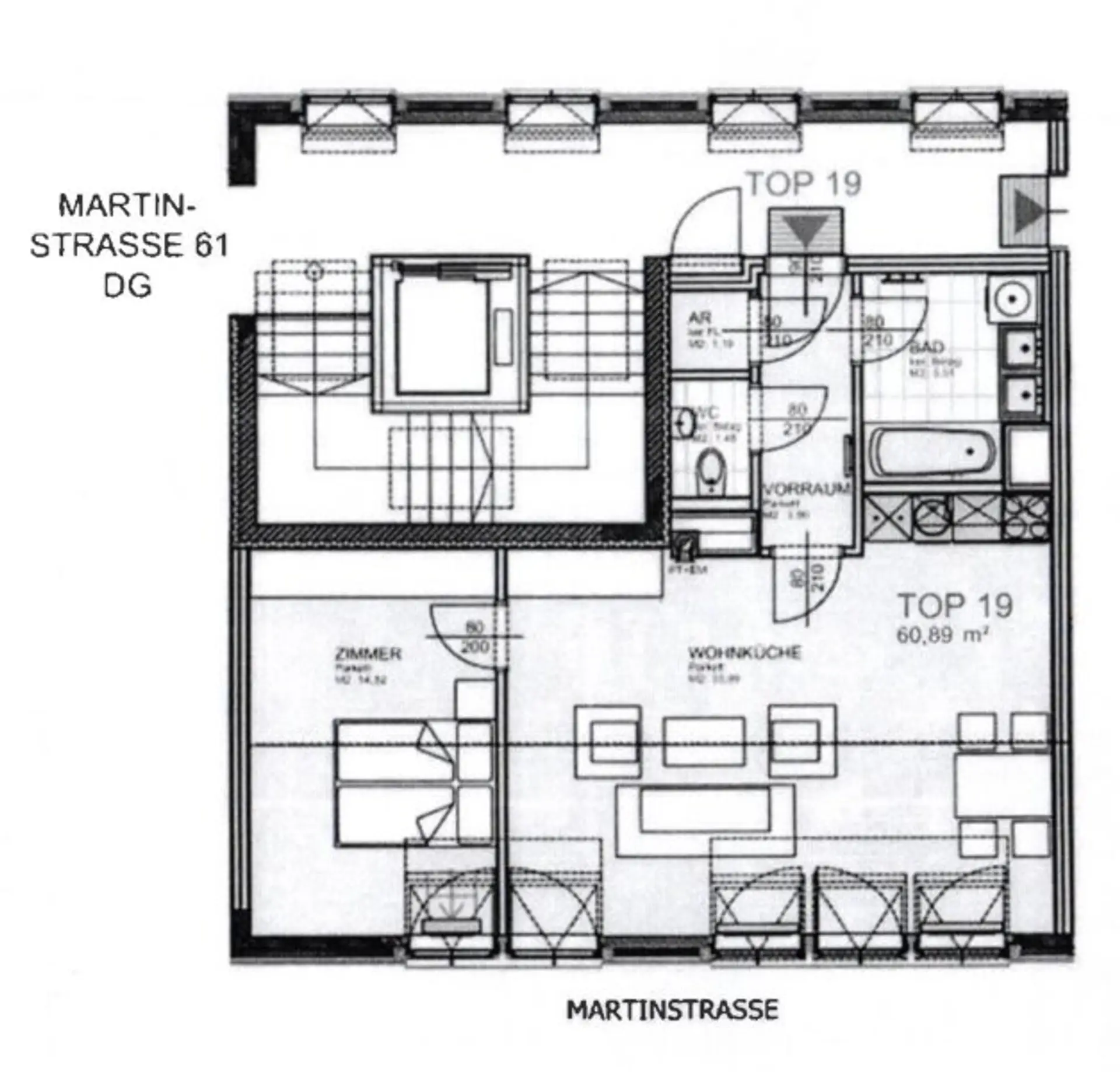 Die Martinstraße bietet eine ausgezeichnete Infrastruktur und verbindet urbanes Flair mit hoher Lebensqualität. In unmittelbarer Umgebung befinden sich Supermärkte, Bäckereien, Cafés, Restaurants sowie Apotheken, Schulen und Kindergärten. Der beliebte Kutschkermarkt ist nur wenige Gehminuten entfernt und lädt mit frischen Produkten und charmanten Gastronomiebetrieben zum Verweilen ein.