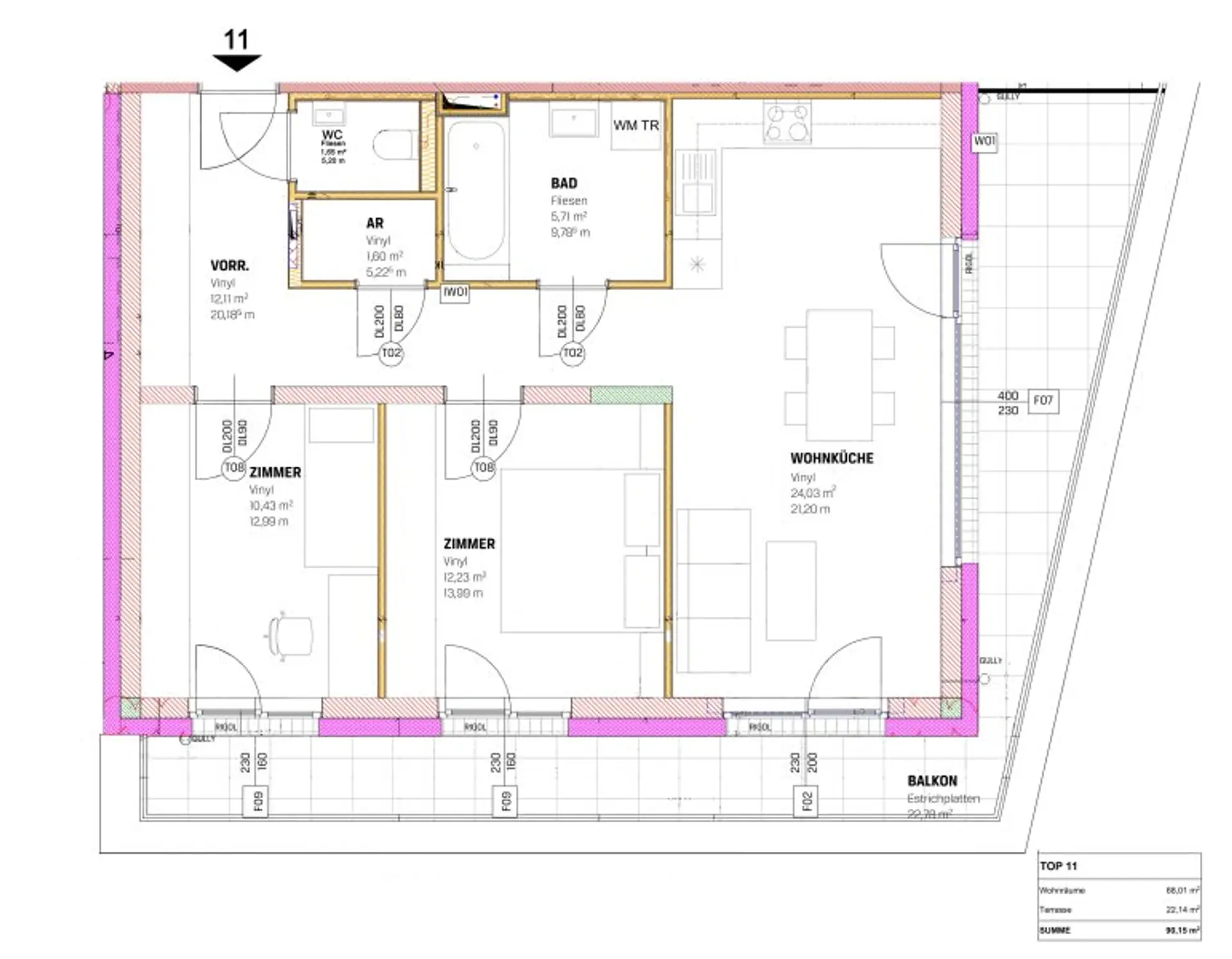 Raumaufteilung: Vorzimmer, Wohnküche, 2 Zimmer, Badezimmer mit Badewanne und Waschtisch, separate Toilette mit Handwaschbecken, Abstellraum, Süd-Ost Terrasse