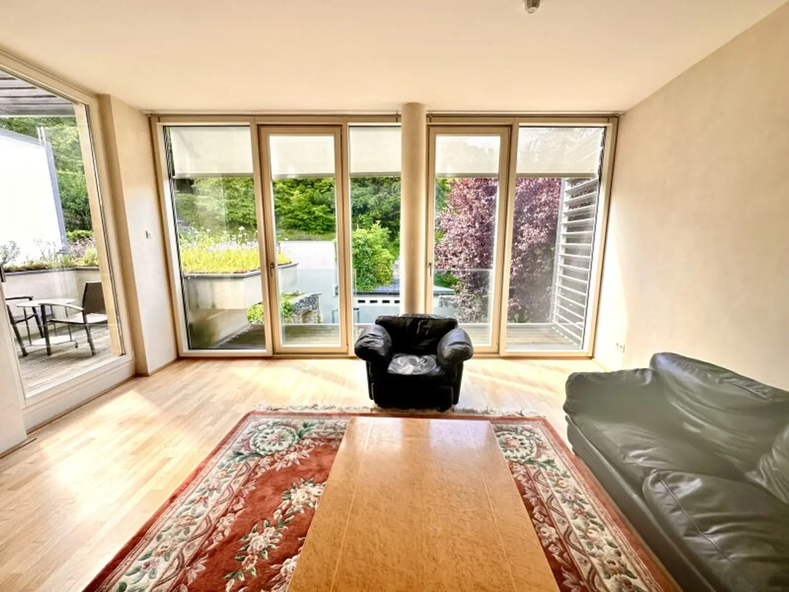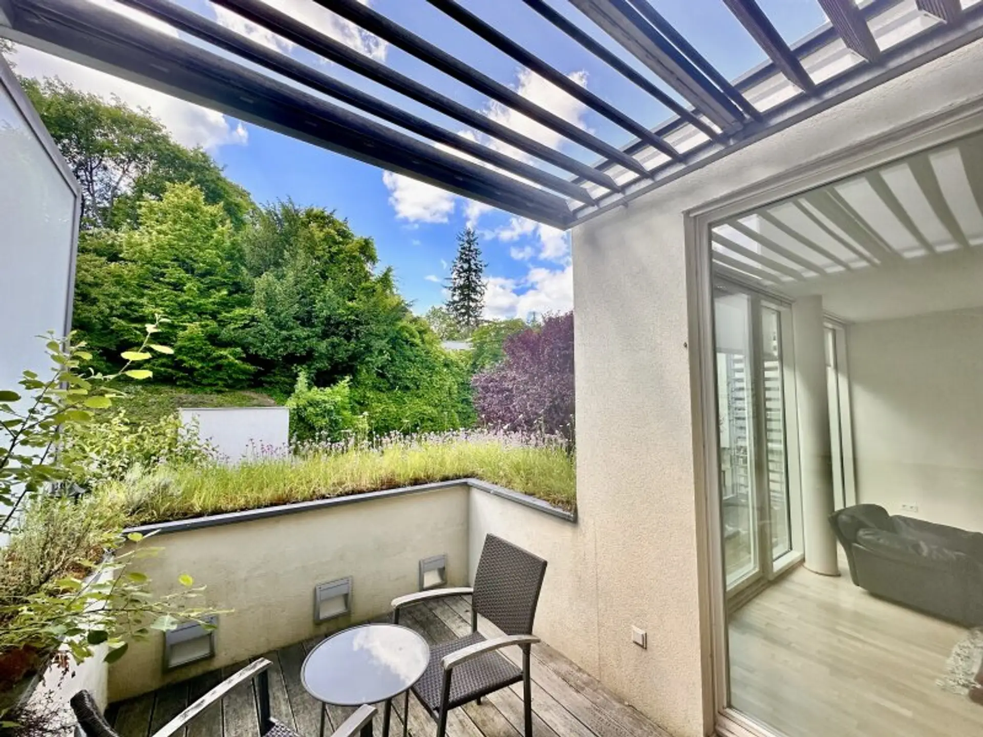 Der großzügige Wohnbereich mit beeindruckenden Panoramafenstern sorgt für ein offenes, lichtdurchflutetes Raumgefühl. Von hier aus gelangen Sie auf die südwestlich ausgerichtete Terrasse mit herrlichem Blick ins Grüne – ein perfekter Rückzugsort zum Entspannen. Ein zusätzlicher Gemeinschaftsgarten direkt neben den Weinbergen rundet das Wohngefühl ideal ab.