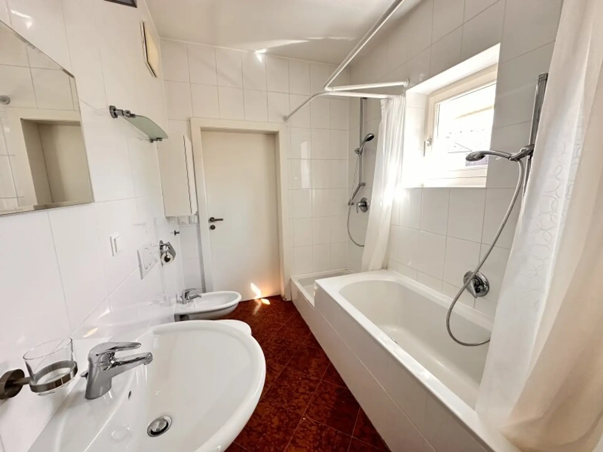 * Badezimmer mit Badewanne, WC, Bidet und Fenster