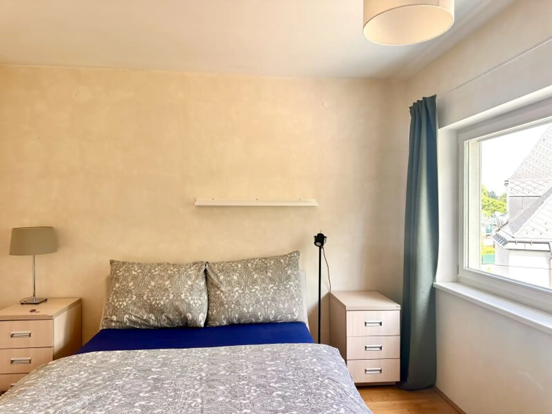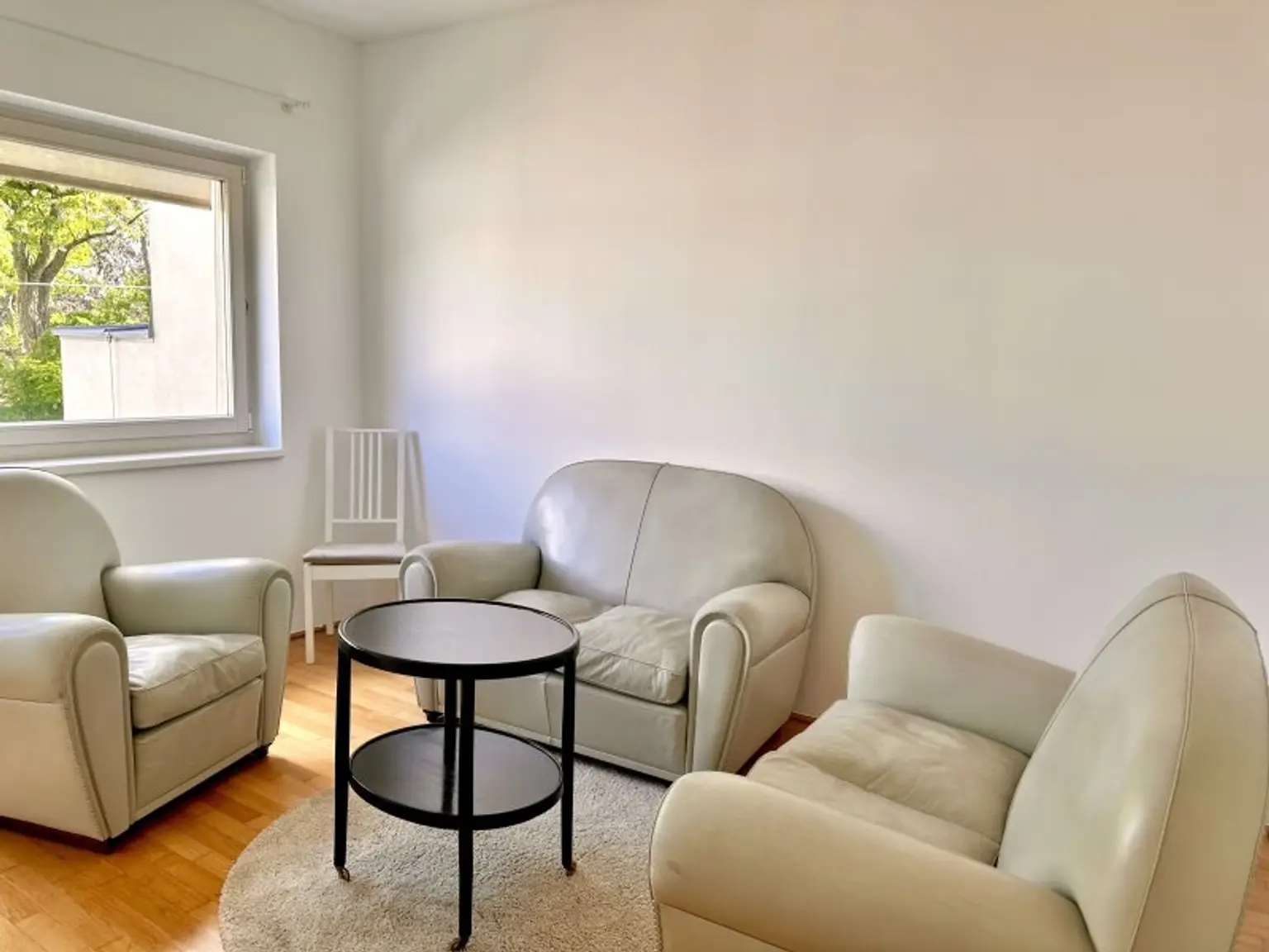 Die Wohnung wird möbliert übergeben und umfasst u. a. Ledersofa, Ledersessel, Fernseher, Couchtisch, Esstisch mit Stühlen, Kommode, Kleiderschrank sowie ein Bett mit Nachttischen.
