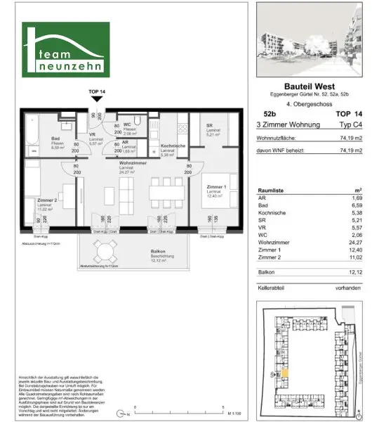Wohnung Haus 52b, Top 14 – Gut geschnittene Wohnung im 4. Obergeschoss mit großem Wohnzimmer, großzügigen Balkon, separatem WC und Abstellkammer