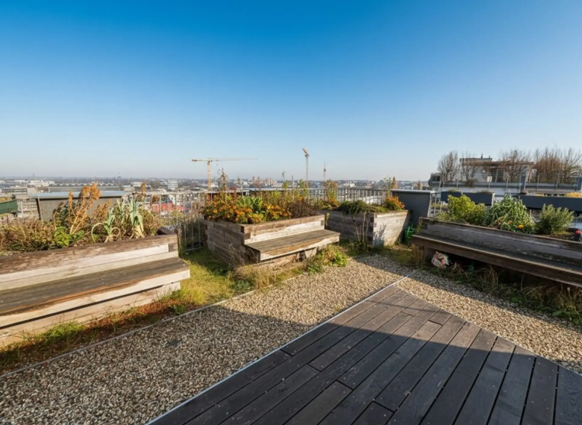 Zugang zur gemeinschaftlichen Dachterrasse mit Blumenbeeten und Fernblick