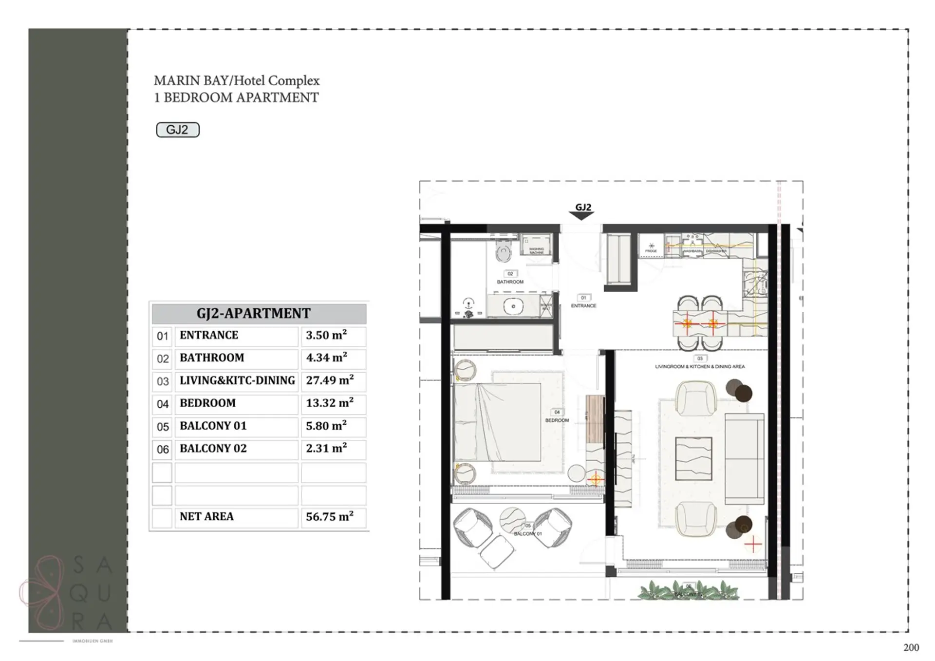 • Layout: Living/dining room with kitchen, bedroom, bathroom, two balconies