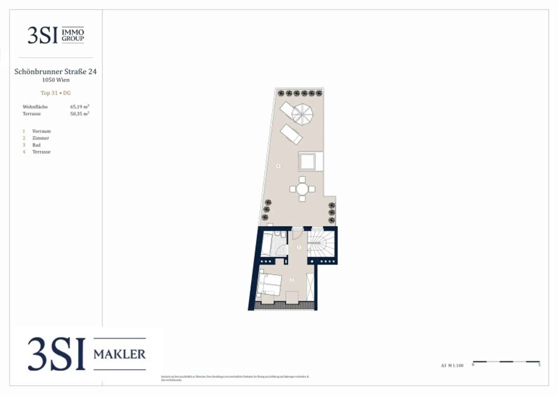 Die Wohnung ist zur Schönbrunner Straße hin in südöstlicher Richtung ausgerichtet, während die großzügige Terrasse in den ruhigen Innenhof nach Nordwesten zeigt.