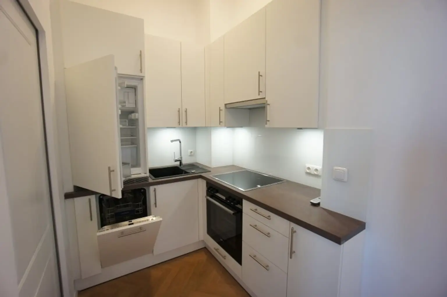 Modern eingerichtete Küche mit sämtlichen Elektrogeräten, die perfekt in den offenen Wohnbereich integriert ist.