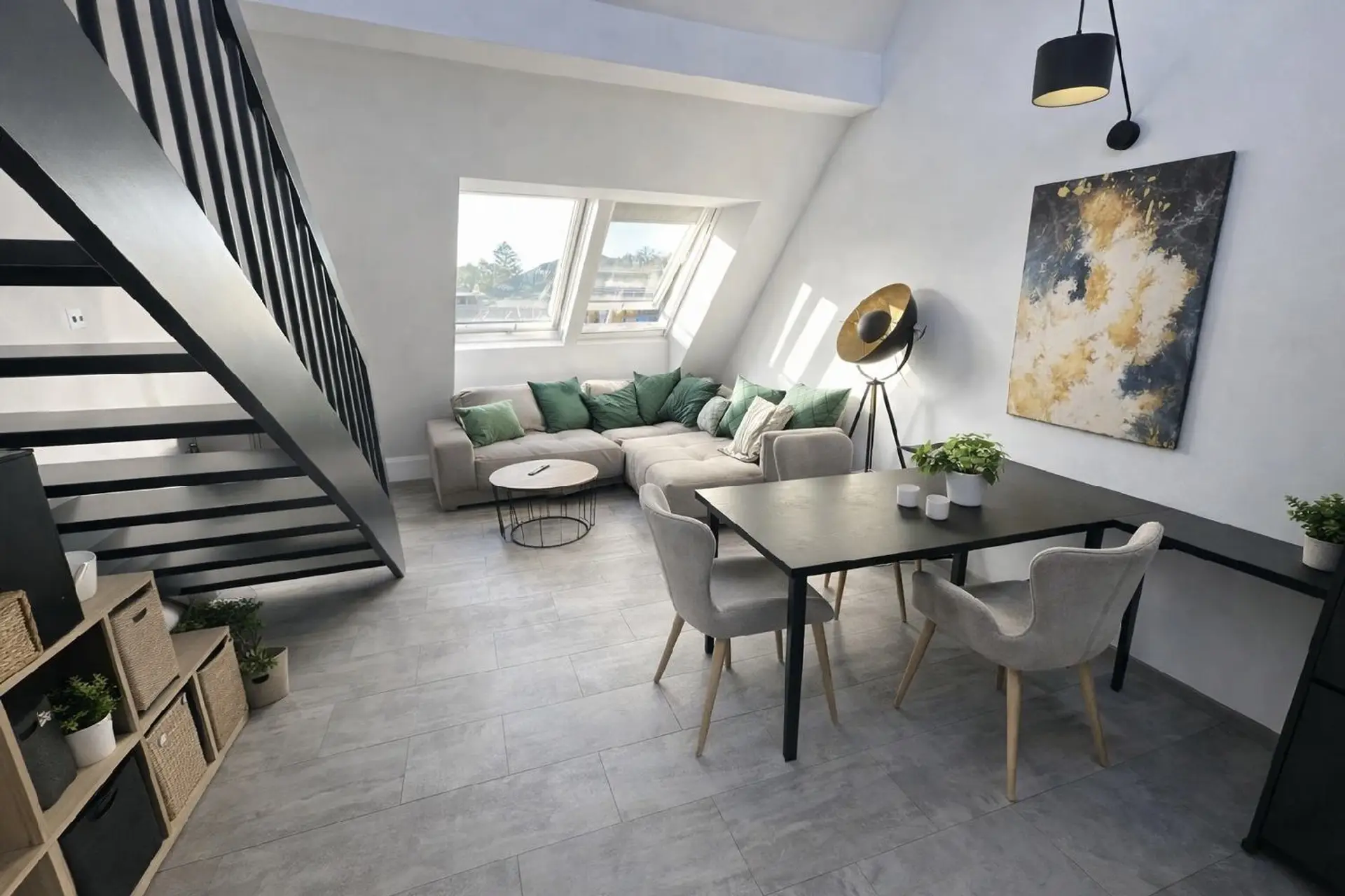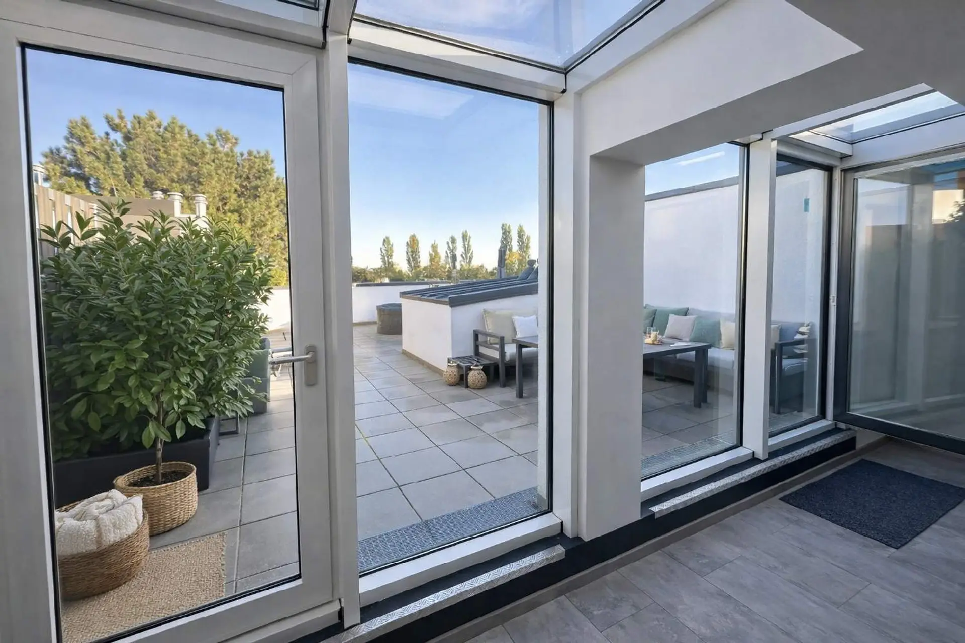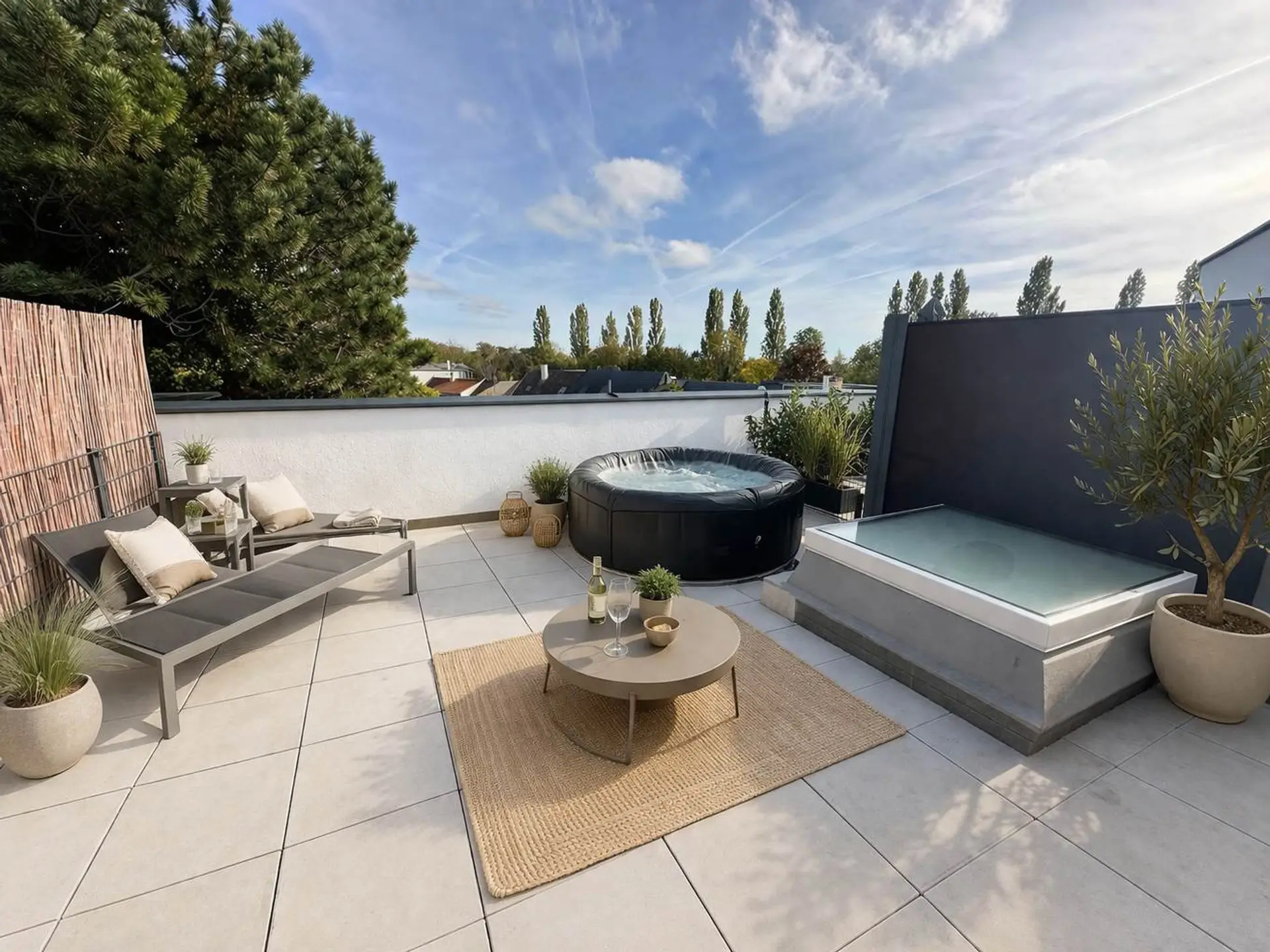 Diese moderne Neubauwohnung im Dachgeschoss eines gepflegten, dreistöckigen Wohnhauses überzeugt durch ihre offene Architektur, hochwertige Ausstattung und ein außergewöhnliches Raumgefühl. Auf rund 69,50 m² Wohnfläche – inklusive einer ca. 15,37 m² großen Galerie – entfaltet sich ein durchdachtes Wohnkonzept, das sowohl funktional als auch ästhetisch höchsten Ansprüchen gerecht wird. Bereits beim Betreten der Wohnung fällt die klare, offene Gestaltung ins Auge. Der Wohnbereich im Erdgeschoss verbindet Küche, Essen und Wohnen zu einer harmonischen Einheit. Die stilvolle Küche fügt sich nahtlos in den Raum ein und bietet ausreichend Stauraum sowie moderne Geräte für den Alltag. Der angrenzende Essbereich und die gemütliche Wohnzone schaffen eine angenehme Atmosphäre, die durch ein stimmiges Lichtkonzept zusätzlich unterstrichen wird. Der Schlafbereich ist bewusst offen und erinnert in seiner Gestaltung an ein modernes Hotelzimmer. Großzügige Schranklösungen sorgen für Ordnung und Komfort, während die freistehende Badewanne und das Waschbecken elegant in den Raum integriert sind. Das separate WC ist mit einem hochwertigen Dusch-WC von Grohe ausgestattet und rundet das durchdachte Raumkonzept ab. Über eine Treppe gelangt man in die Galerie im Obergeschoss, die mit ihren Dachschrägen einen besonders charmanten Rückzugsort darstellt. Ob als Homeoffice, Leseecke oder zusätzlicher Wohnbereich – dieser Raum bietet vielfältige Nutzungsmöglichkeiten und verleiht der Wohnung eine besondere architektonische Qualität. Von hier aus gelangt man direkt auf das absolute Highlight der Immobilie: die rund 47 m² große Dachterrasse. Die Terrasse bietet ein außergewöhnliches Maß an Privatsphäre, da kein direktes Gegenüber vorhanden ist. Stattdessen eröffnet sich ein freier Blick ins Grüne auf gewachsene Bäume – eine seltene Kombination aus urbanem Wohnen und naturnahem Rückzugsort. Ob entspannte Stunden in der Sonne oder gesellige Abende – dieser Außenbereich erweitert den Wohnraum auf ideale Weise. Auch technisch ist die Wohnung auf einem zeitgemäßen Niveau ausgestattet. Eine Luft/Wasser-Wärmepumpe sorgt für effiziente Energieversorgung, während drei Klimageräte in allen Wohnbereichen auch an heißen Tagen für angenehme Temperaturen garantieren. Ein Kellerabteil bietet zusätzlichen Stauraum. Zu beachten ist, dass die ursprüngliche Raumanordnung im Bereich Schlafzimmer sowie Bad/WC angepasst wurde – die aktuelle Ausführung entspricht der beigefügten Skizze. Zusätzlich ist ein Garagenstellplatz um € 15.000,– zu erwerben. Lage Die Wohnung befindet sich in Süßenbrunn, einem aufstrebenden und gleichzeitig angenehm ruhigen Stadtteil im Norden Wiens. Die Lage zeichnet sich durch eine gelungene Mischung aus naturnahem Wohnen und guter Erreichbarkeit aus. Direkt vor der Haustüre befindet sich eine Bushaltestelle, wodurch eine unkomplizierte Anbindung an das öffentliche Verkehrsnetz gewährleistet ist. Die Schnellbahnstation Süßenbrunn ist in etwa 15 Gehminuten erreichbar und bietet eine rasche Verbindung in Richtung Stadtzentrum sowie ins Umland. Ein besonderer Mehrwert entsteht durch die aktuelle Umgestaltung des Platzes vor dem Gebäude, der künftig als attraktiver Grün- und Parkraum genutzt wird. Dadurch gewinnt die unmittelbare Umgebung zusätzlich an Aufenthaltsqualität und unterstreicht den ruhigen, grünen Charakter der Lage. Insgesamt bietet diese Wohngegend eine ideale Kombination aus Rückzug, Natur und gleichzeitig guter infrastruktureller Anbindung – perfekt für alle, die entspannt wohnen möchten, ohne auf die Vorzüge der Stadt verzichten zu müssen.