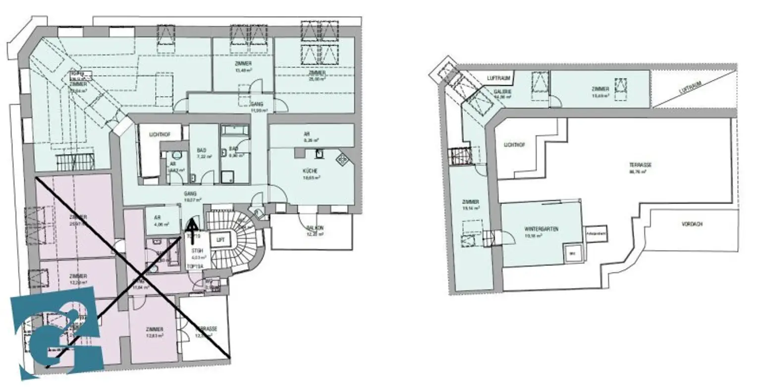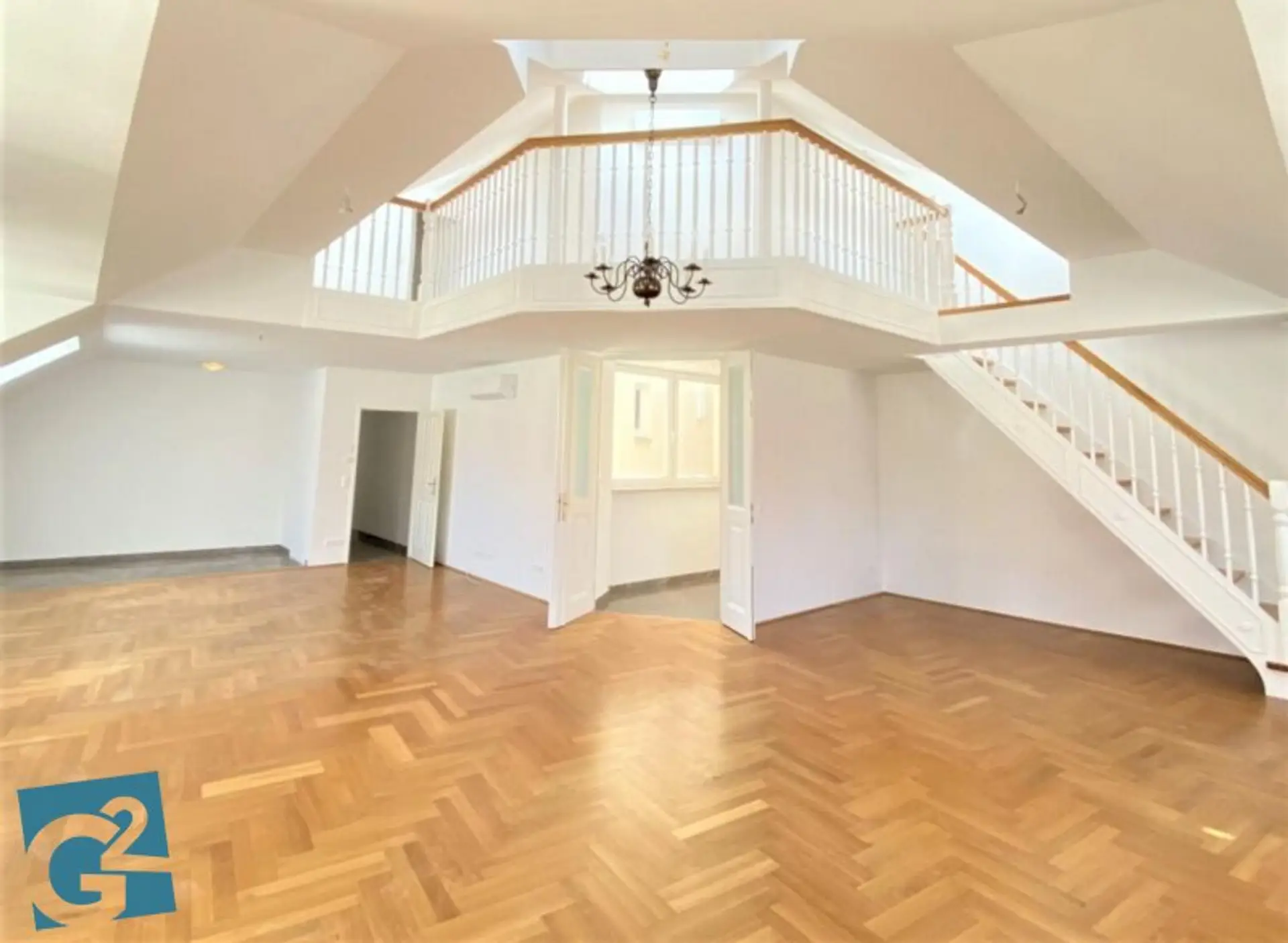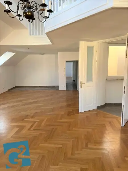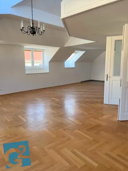 Zum Verkauf gelangt eine repräsentative Dachgeschoßwohnung auf 2 Ebenen mit ca. 260m² Nutzfläche sowie ca. 100m² Freifläche (12m² südseitiger Balkon und 87m² Dachterrasse) in einem sehr gepflegten, charmanten Altbau an der Ecke Alseggerstraße / Ferrogasse.