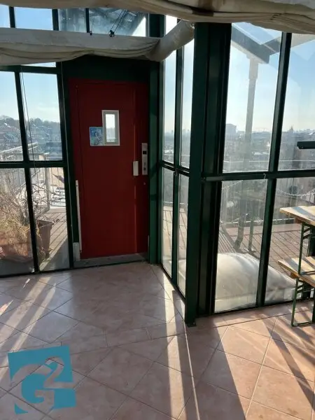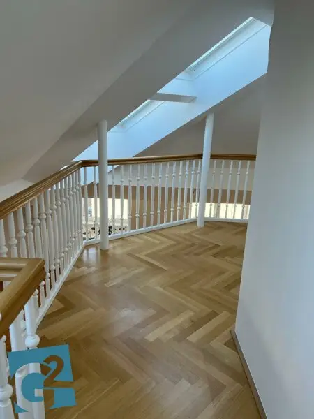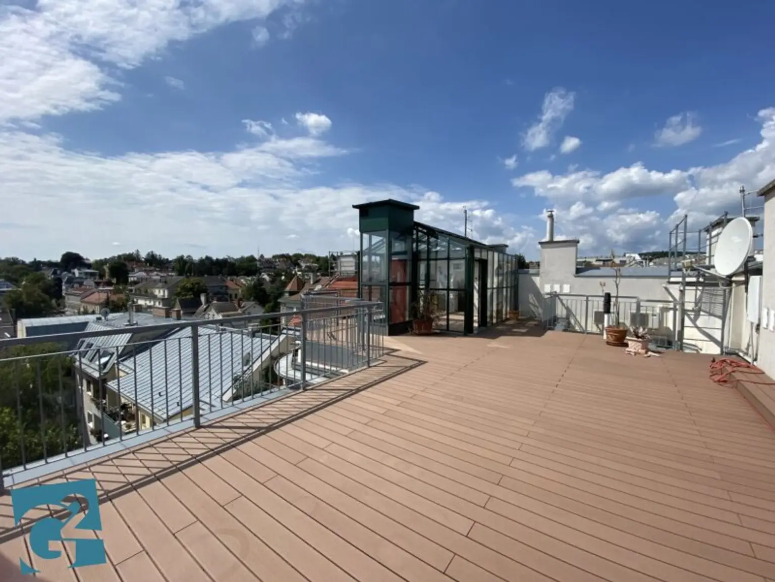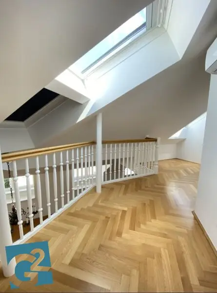 Das Obergeschoß ( = 2. Dachgeschoß) besteht aus einer offenen Galerie sowie 2 weiteren, kleineren Räumen (mit Dachschrägen). Von dort gelangt man über wenige Stufen auf die beeindruckende Dachterrasse mit einem rundum verglasten Wintergarten, welcher über eine eigene Liftstation verfügt und exklusiv den Bewohnern zur Verfügung steht. Die außergewöhnliche Größe der Terrasse und der Blick auf die Stadt sowie die angrenzenden Bezirke sind einzigartig. Absolute Privatsphäre ist garantiert, da die Terrasse nicht einsehbar ist.