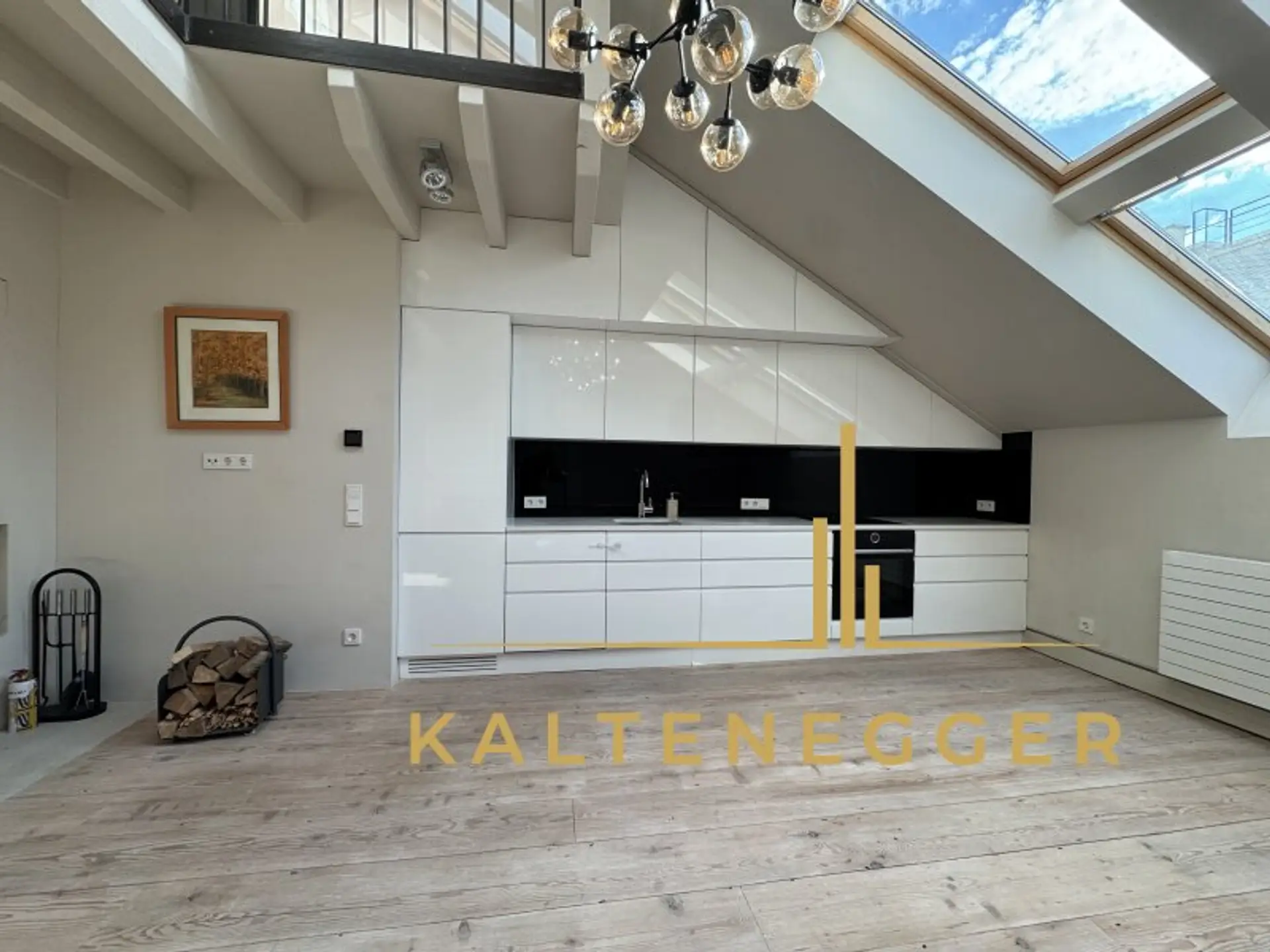 Schon beim Betreten beeindruckt der großzügige Wohn- und Küchenbereich mit sichtbaren Holzbalken, stilvollem Kamin und großen Dachflächenfenstern, die den Raum in warmes Licht tauchen. Die moderne Küche ist perfekt integriert und lädt zum gemeinsamen Kochen ein.