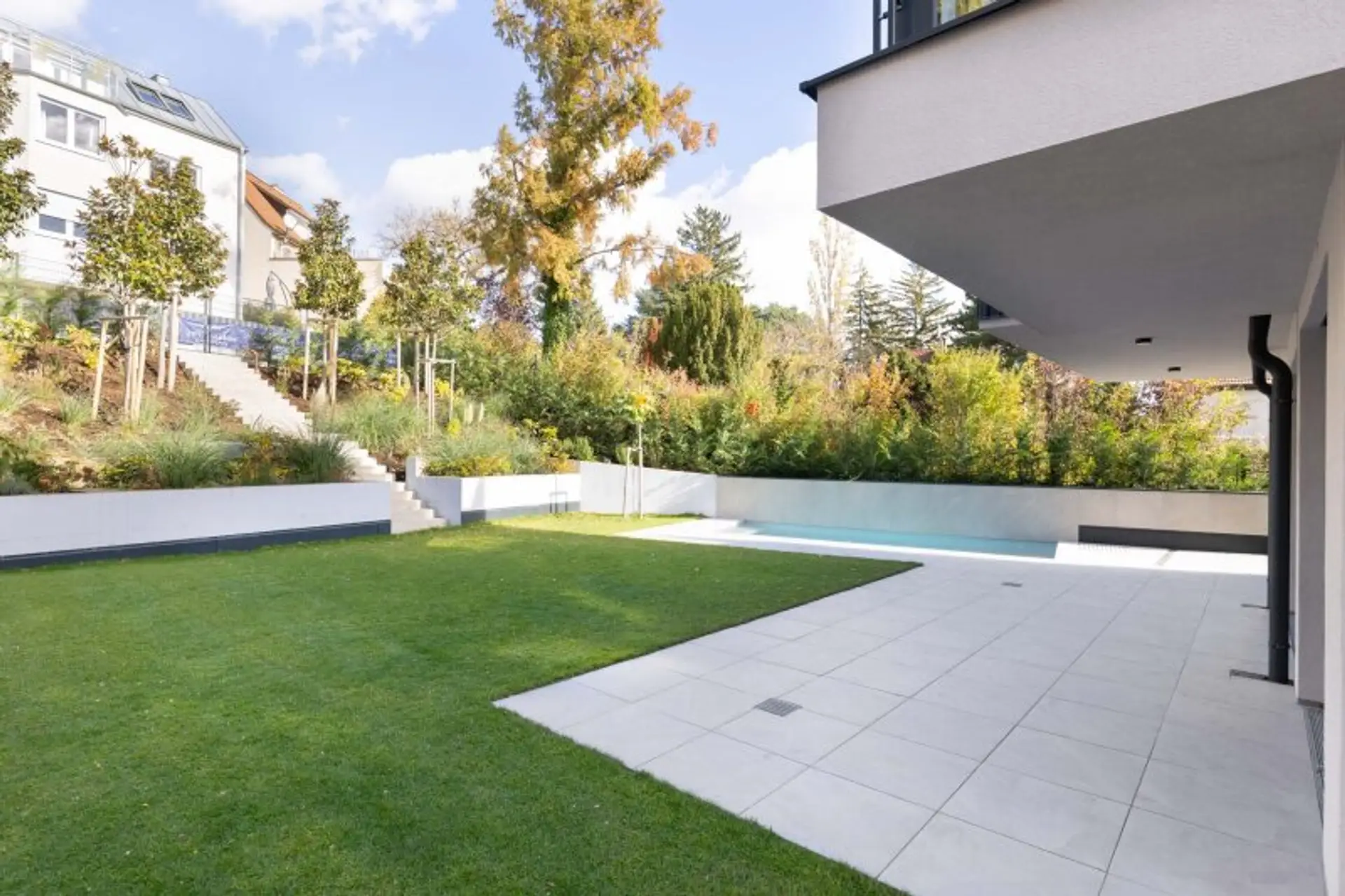 Der Blick vom Vorraum schweift aufgrund der offenen Gestaltung bereits in Richtung Herzstück der Liegenschaft: der Wohnküche, mit einer wunderbaren Größe von 37,47 m². Die deckenhohen Fenster und Schiebetüren lassen den Raum noch größer wirken und geben einen fantastischen Ausblick auf die knapp 42 m² große Terrasse und den eigenen Garten frei. Die Gestaltung des Gartens wird durch Gartenarchitekten in französischem Stil und durch Pflanzenbeleuchtung von unten in Szene gesetzt. Der hochwertige Salzwasser-Infinity-Pool wirkt atemberaubend schön und rundet letztendlich den Hochgenuss im Freien ab.