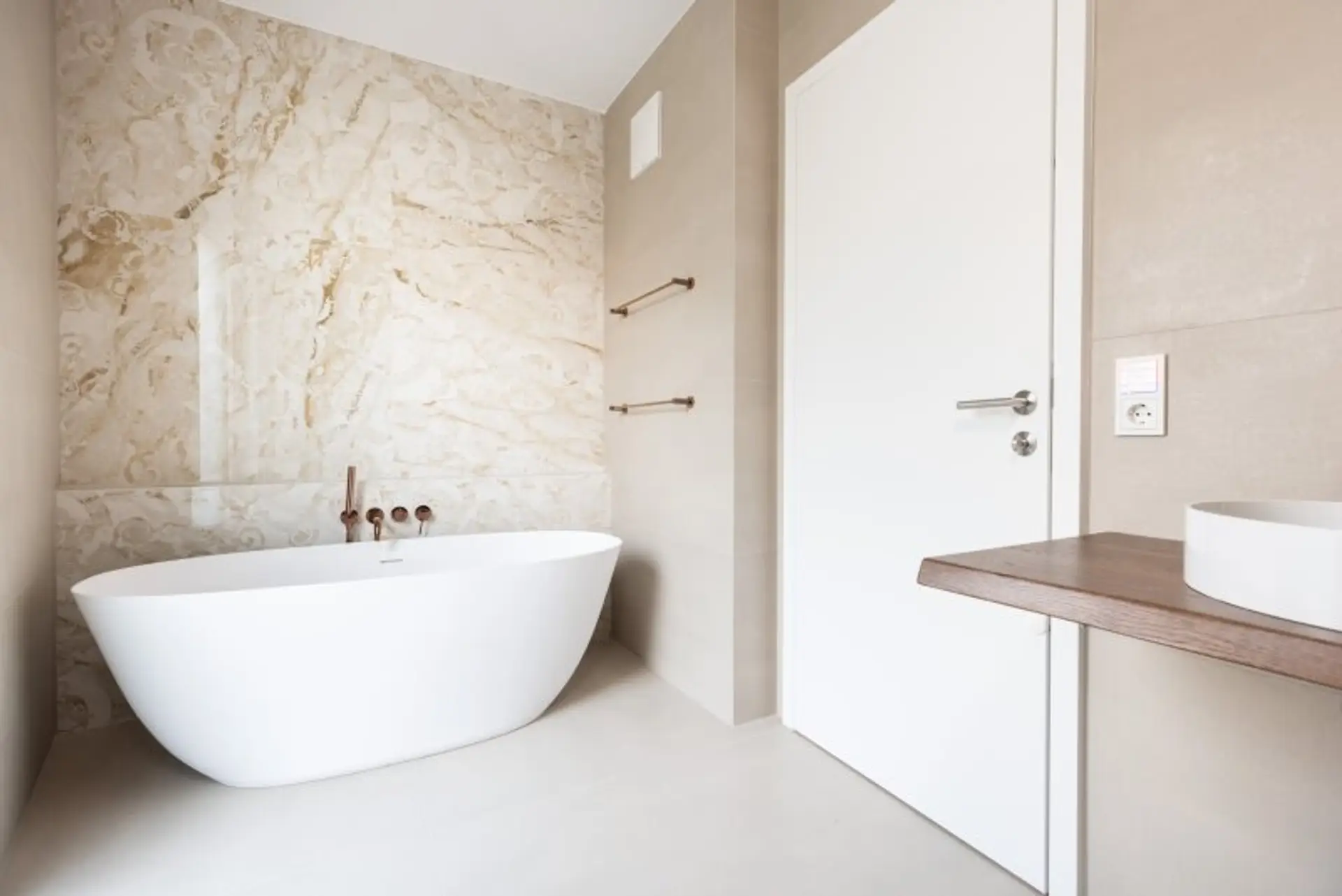 In Bädern und auf Terrassen kommt großformatiges Feinsteinzeug zum Einsatz: