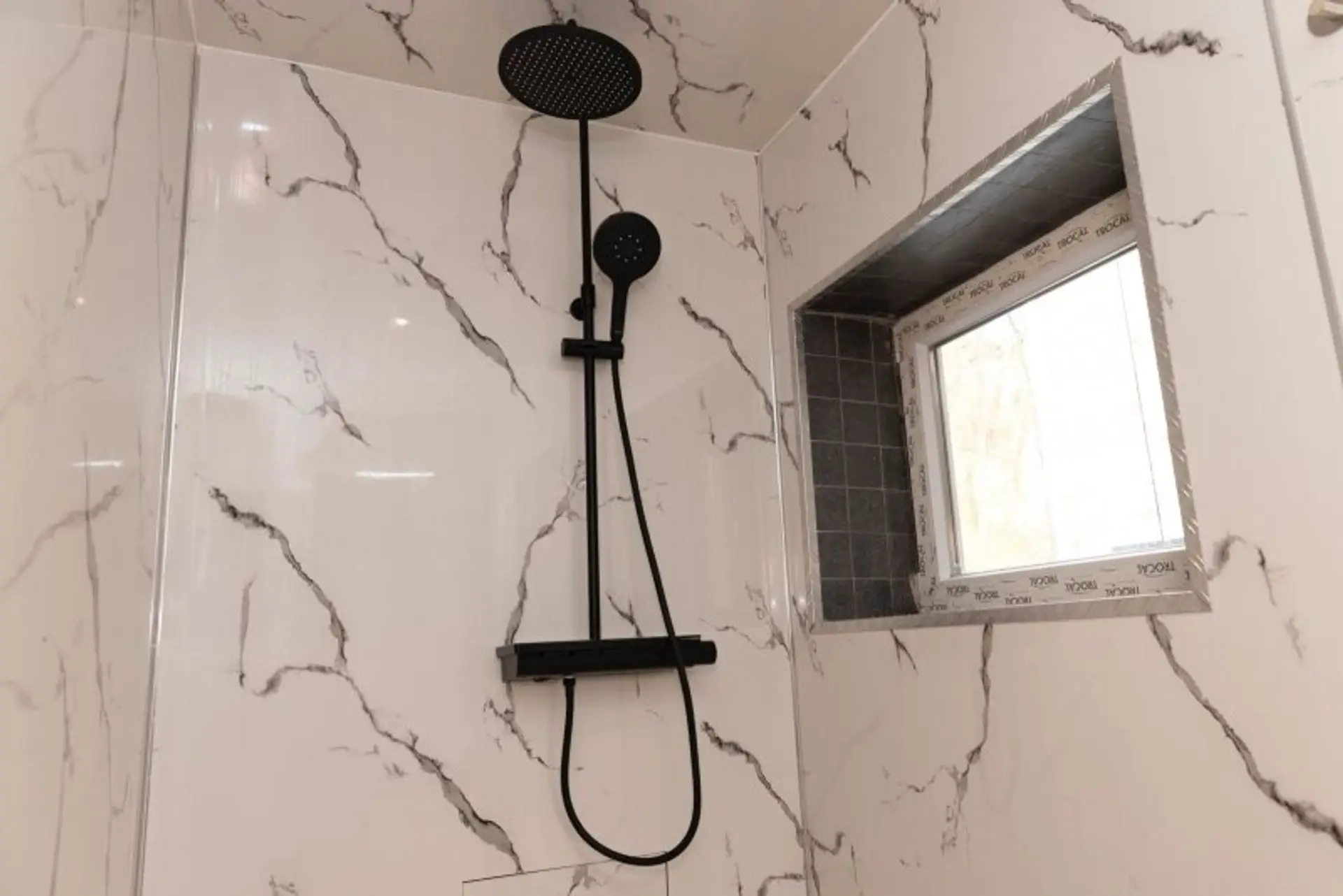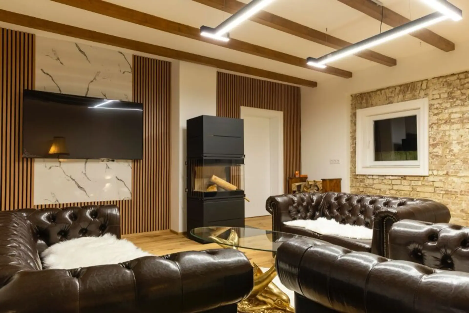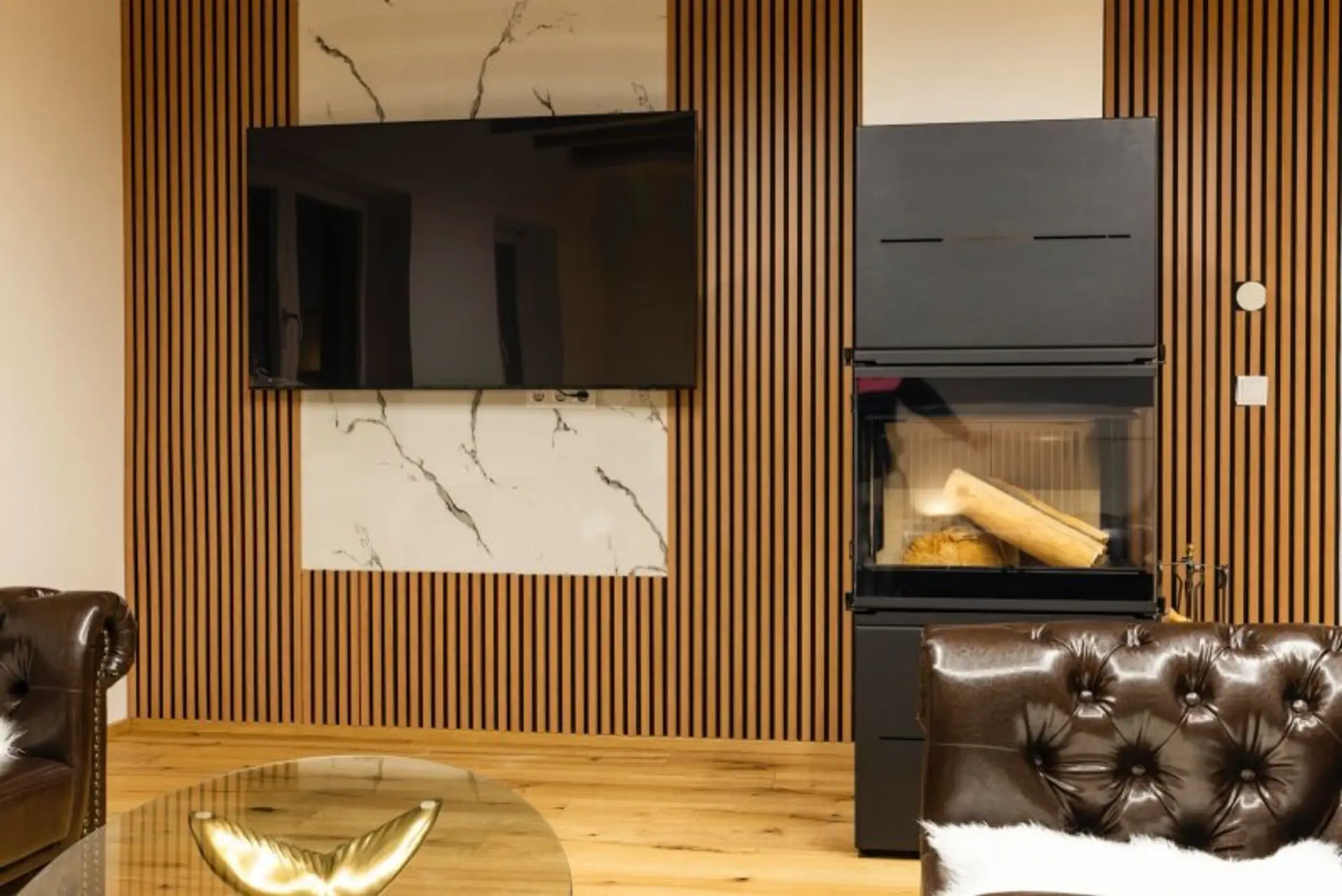 • Marmor-Fensterbänke (Bianco Carrara) und offener schwedischer Kaminofen (11 kW)