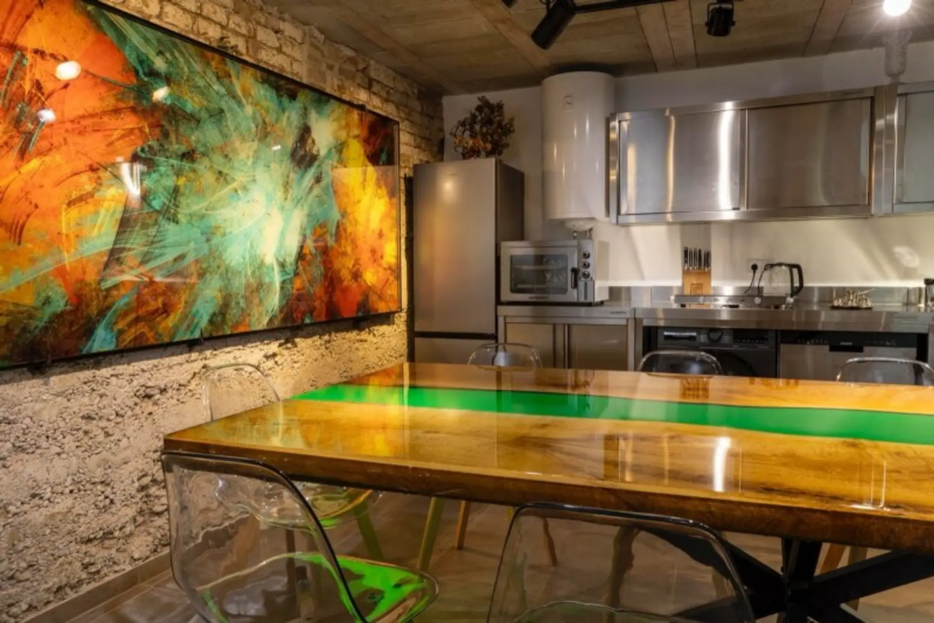 • Großzügiger Esstisch aus 35 Jahre alter Eiche (2,61 x 1,20 m), veredelt mit Epoxidharz