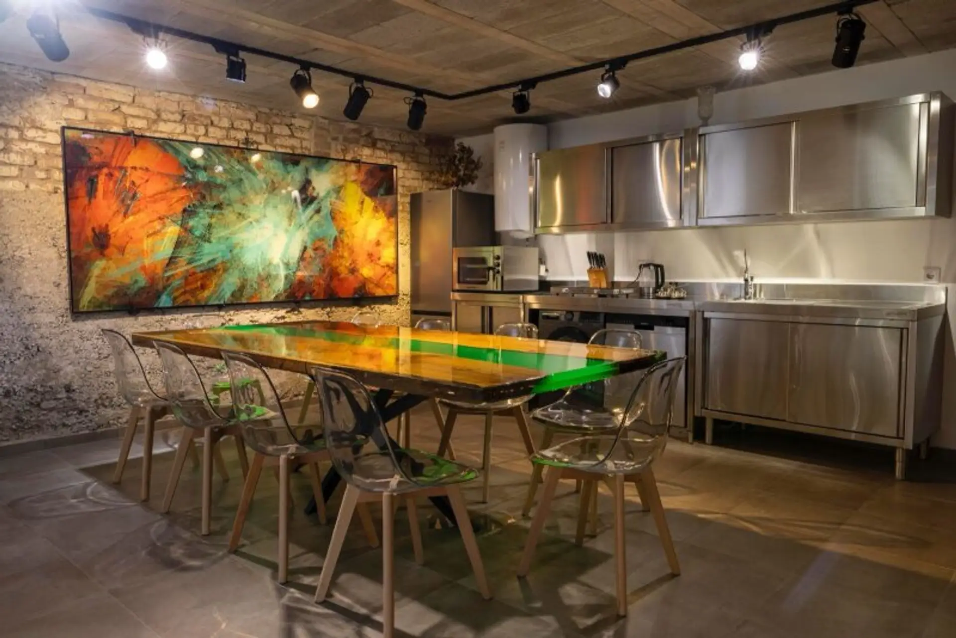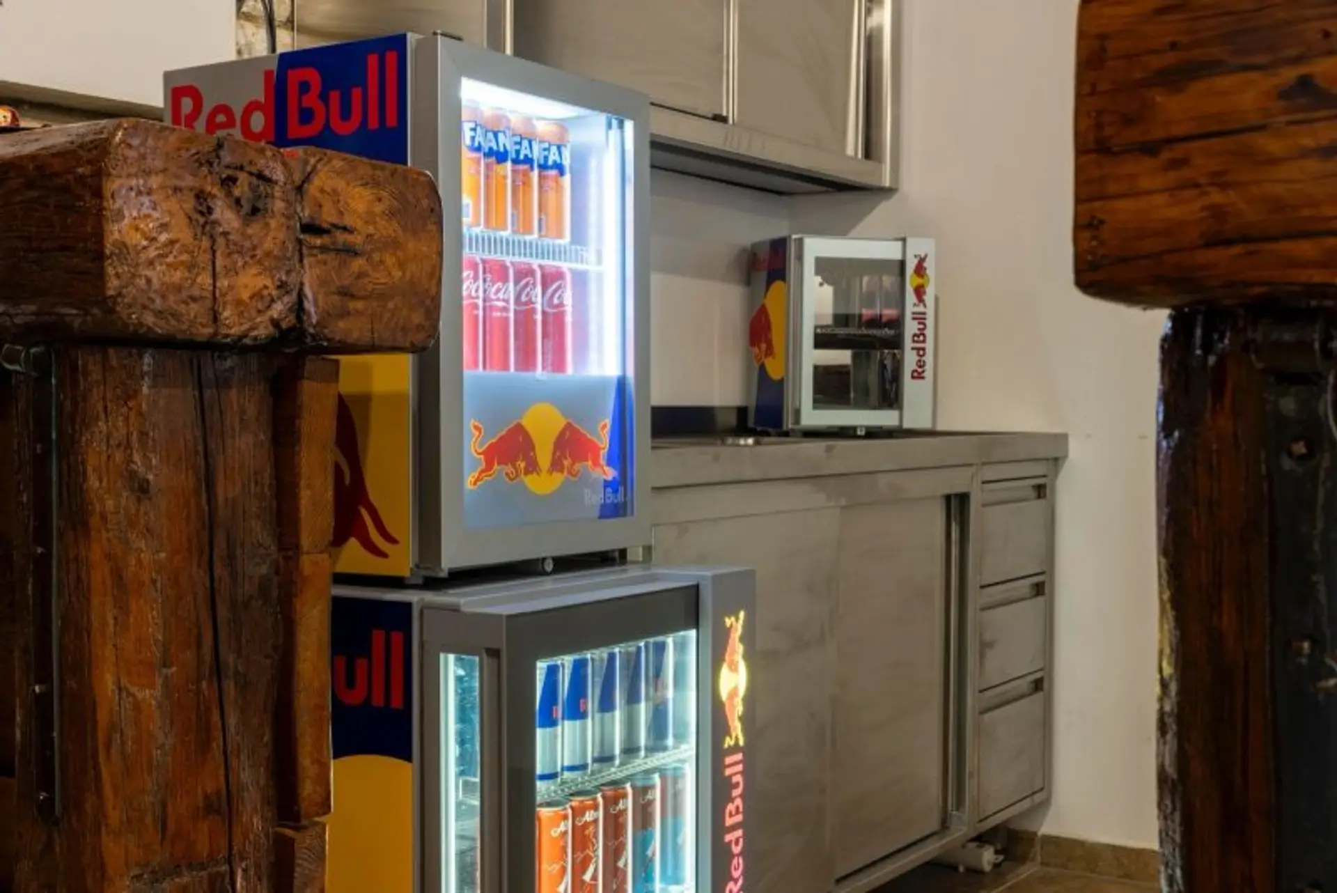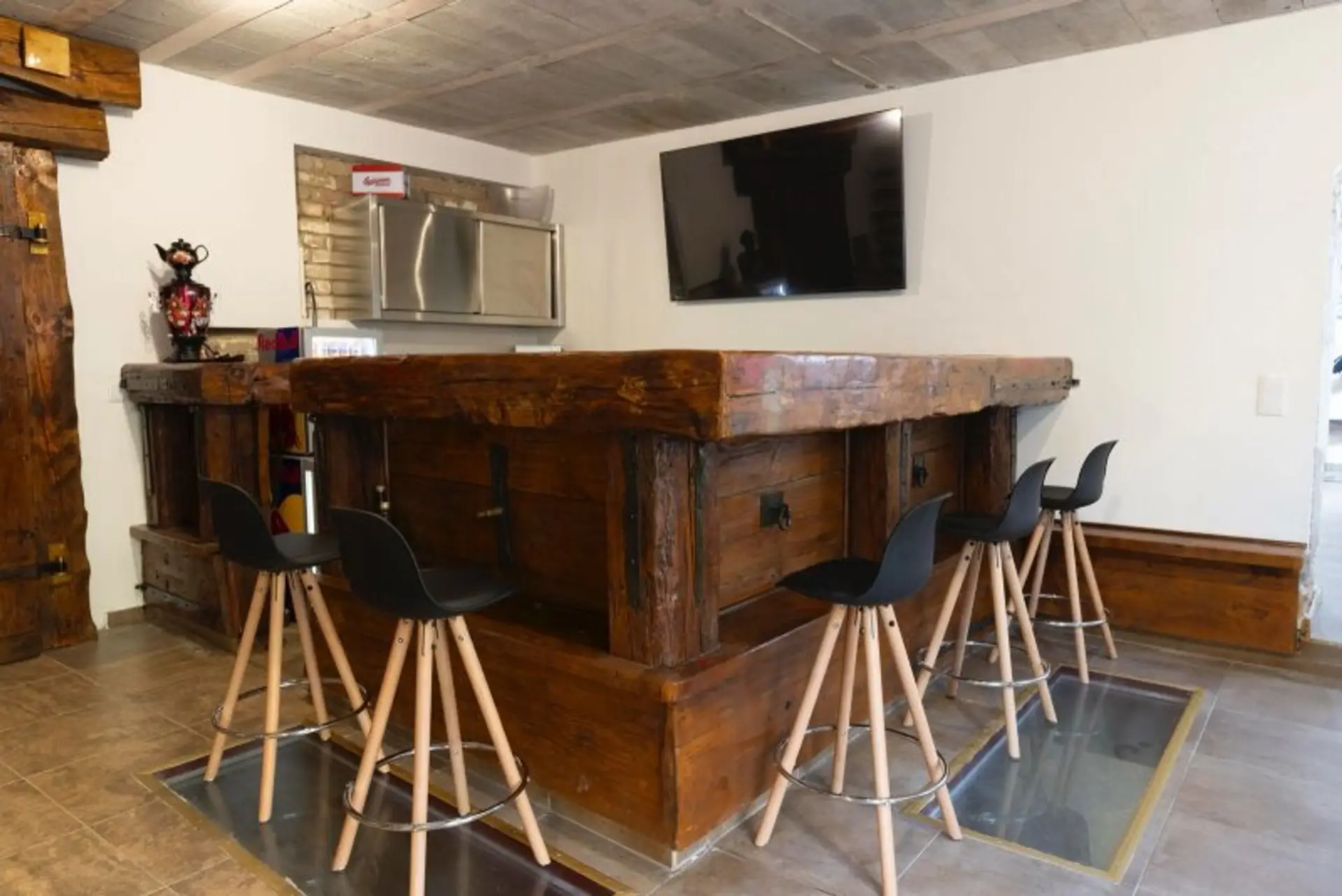 • 8 Meter lange Bar aus 170 Jahre altem Holz, handgeschmiedeten Eisenelementen und modernem LED-Farbwechselsystem