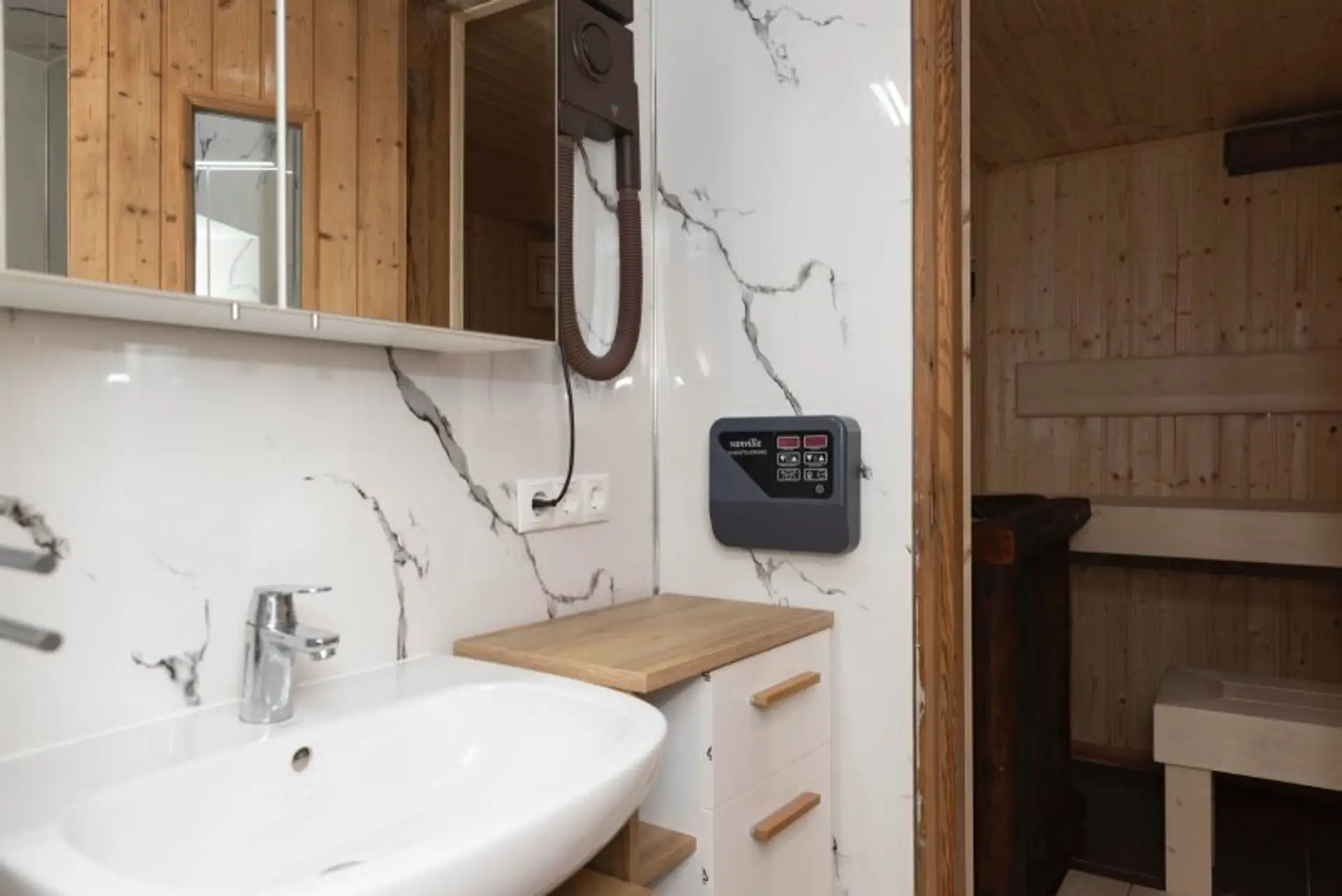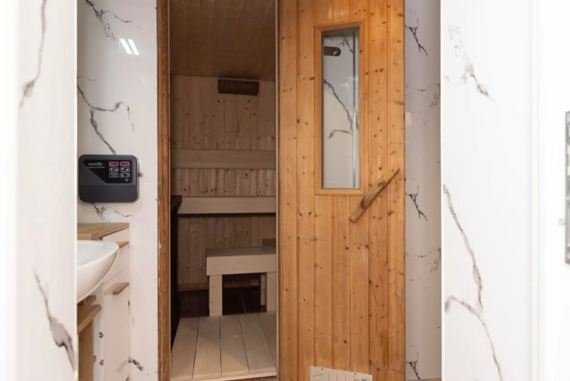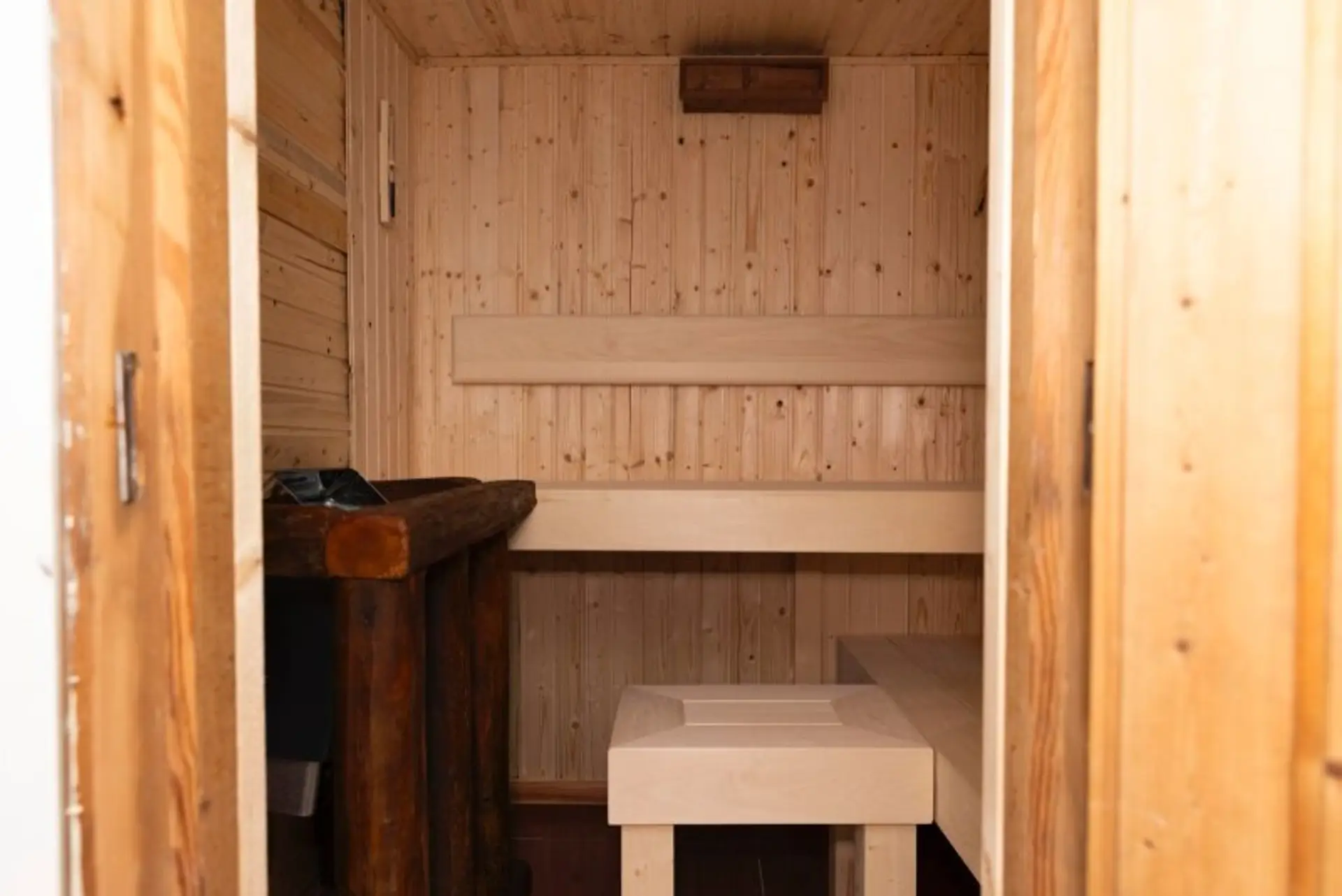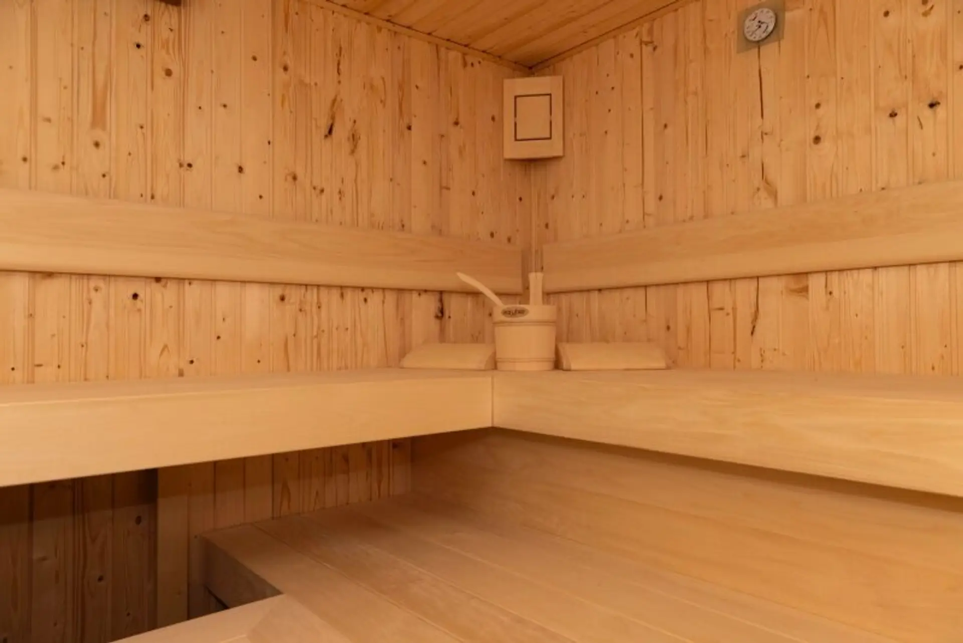 • Sauna (6 m², Fa. Gruber) mit Platz für 6 Personen und beheizbaren Sitzen