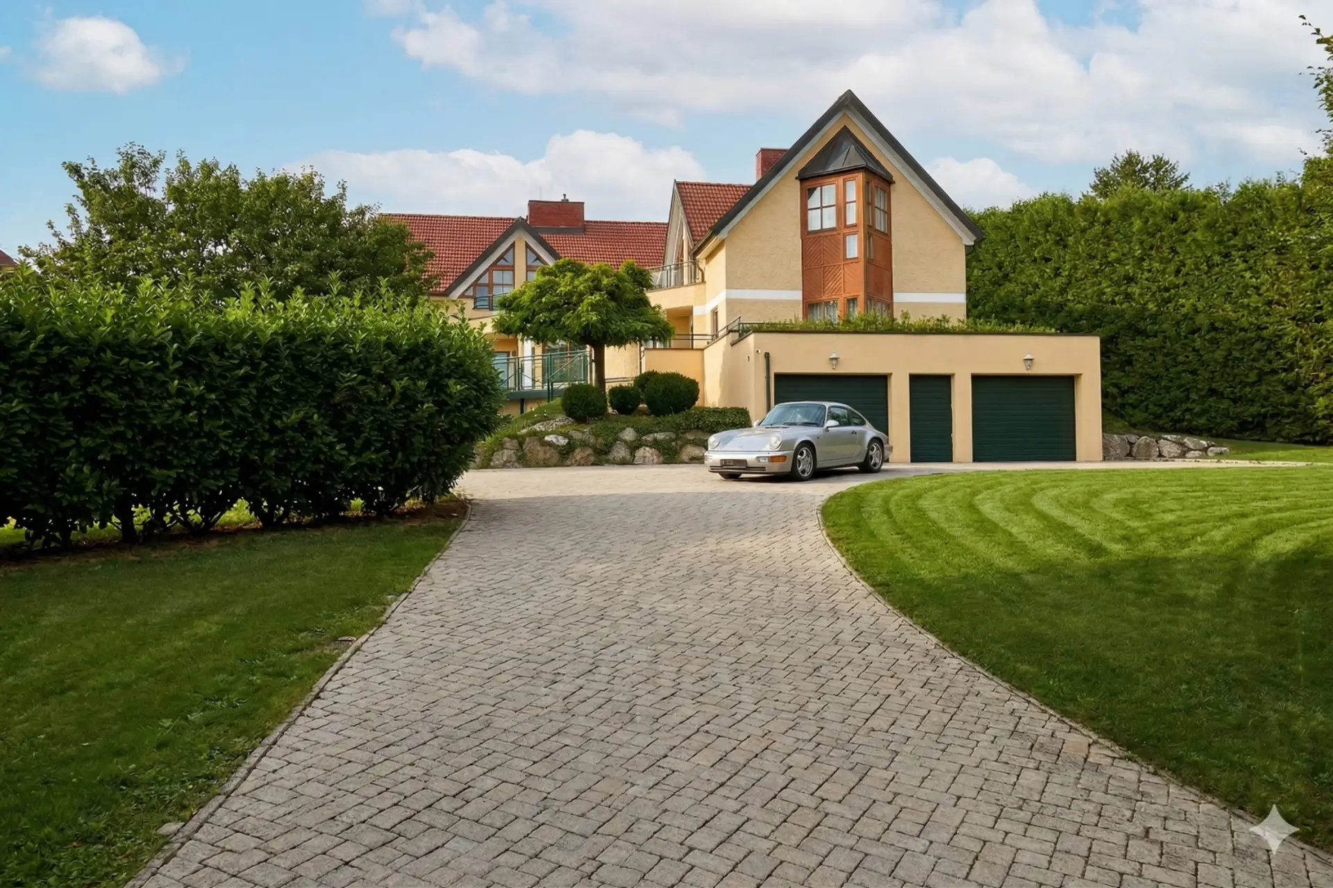 Mit einer Wohnfläche von ca. 700 m² und insgesamt 20 Räumen bietet die Liegenschaft vielseitige Nutzungsmöglichkeiten – von exklusivem Familiensitz bis hin zu repräsentativen Wohn- und Arbeitskonzepten. Die Architektur erstreckt sich über drei Ebenen und verbindet klassische Substanz mit modernisierten Elementen. Großzügige Terrassenflächen, Balkon und Wintergarten schaffen fließende Übergänge zwischen Innen- und Außenraum.