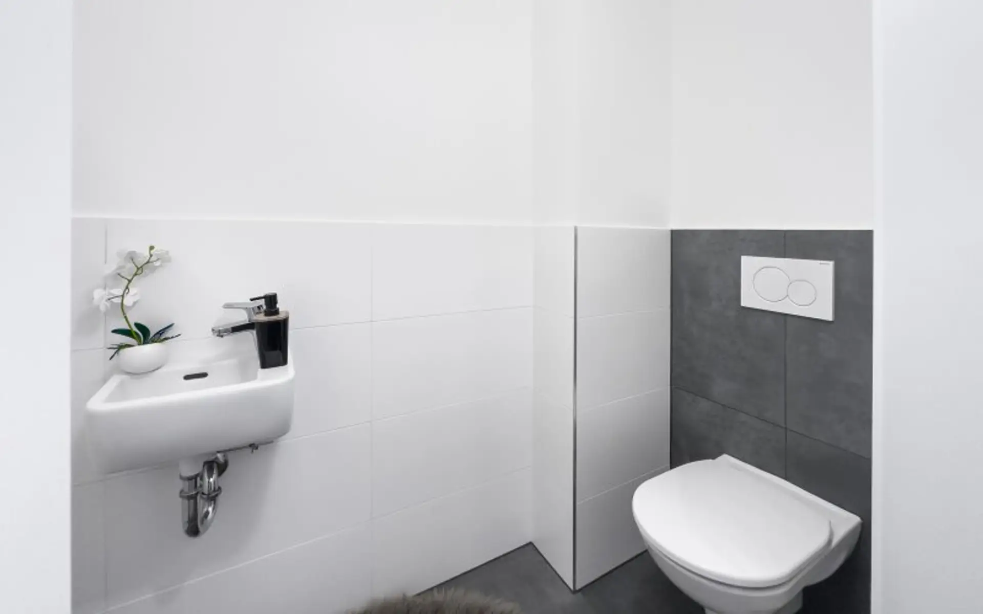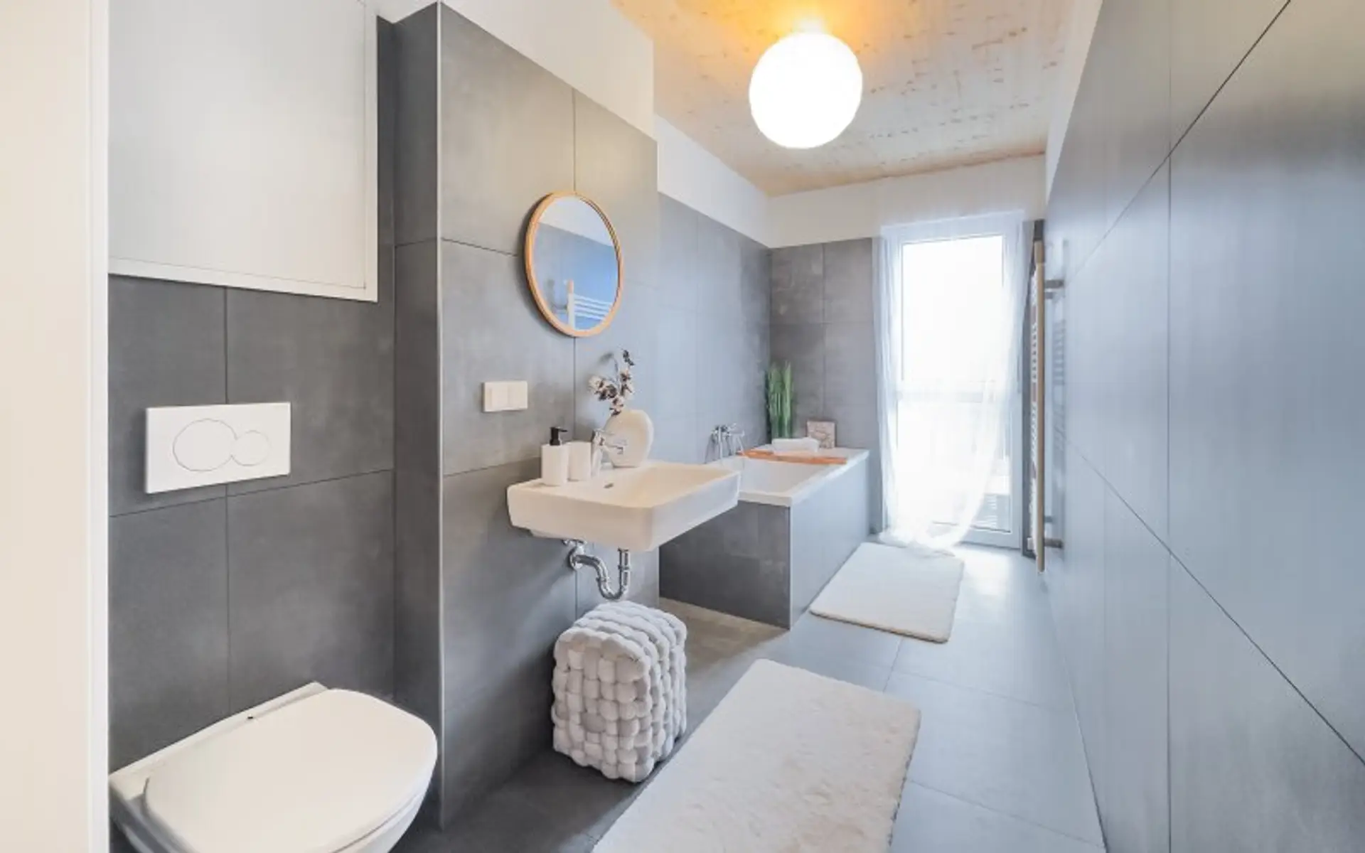 hochwertige Sanitärgegenstände und großformatiges Feinsteinzeug in den Sanitärräumen