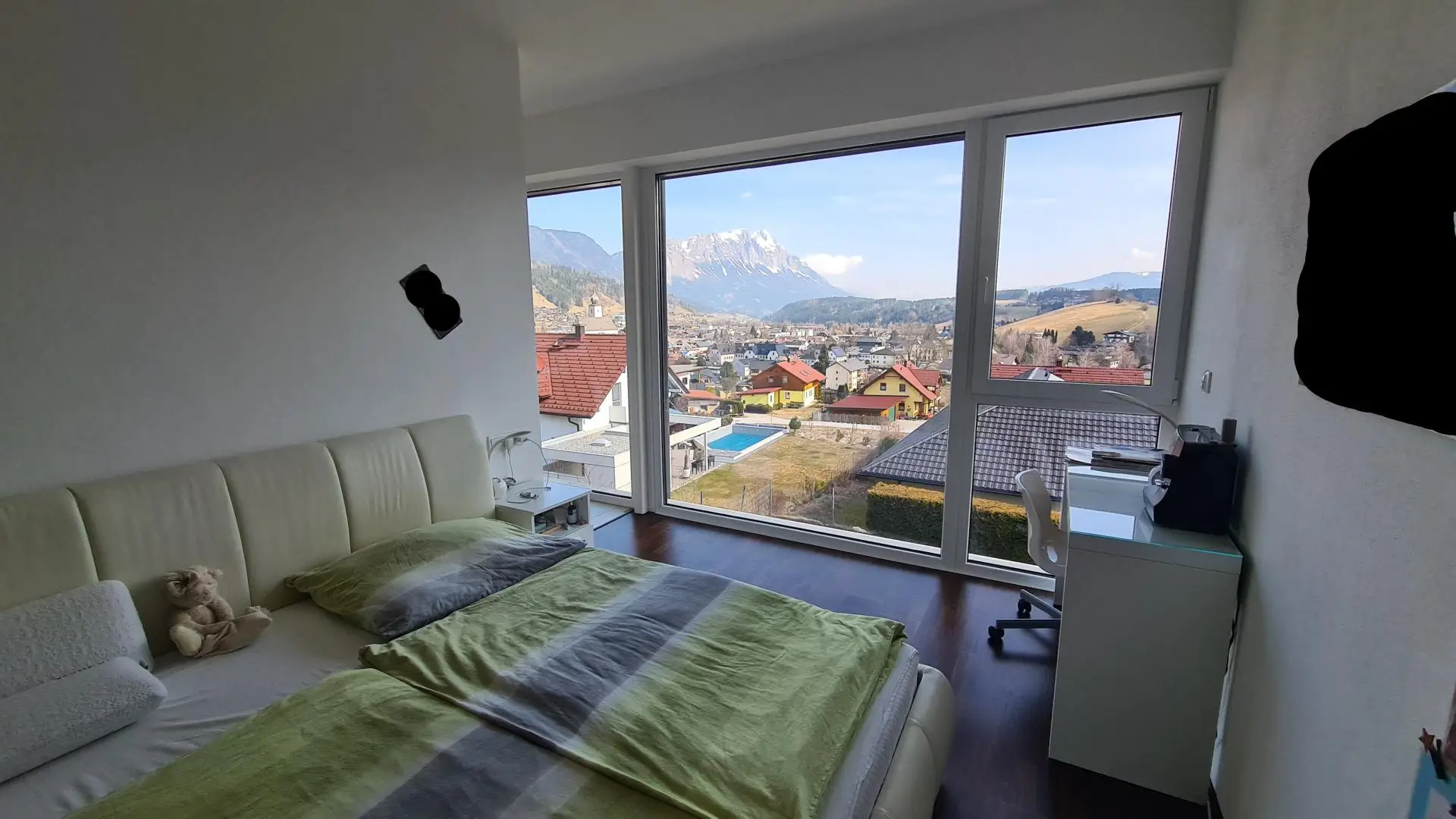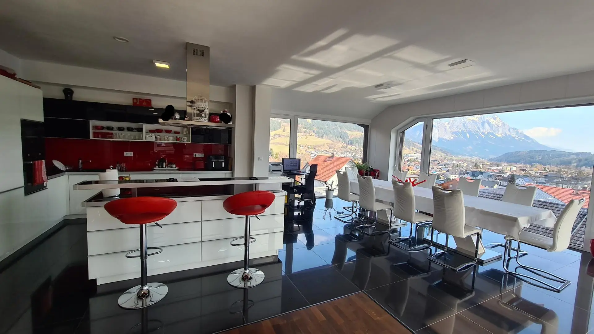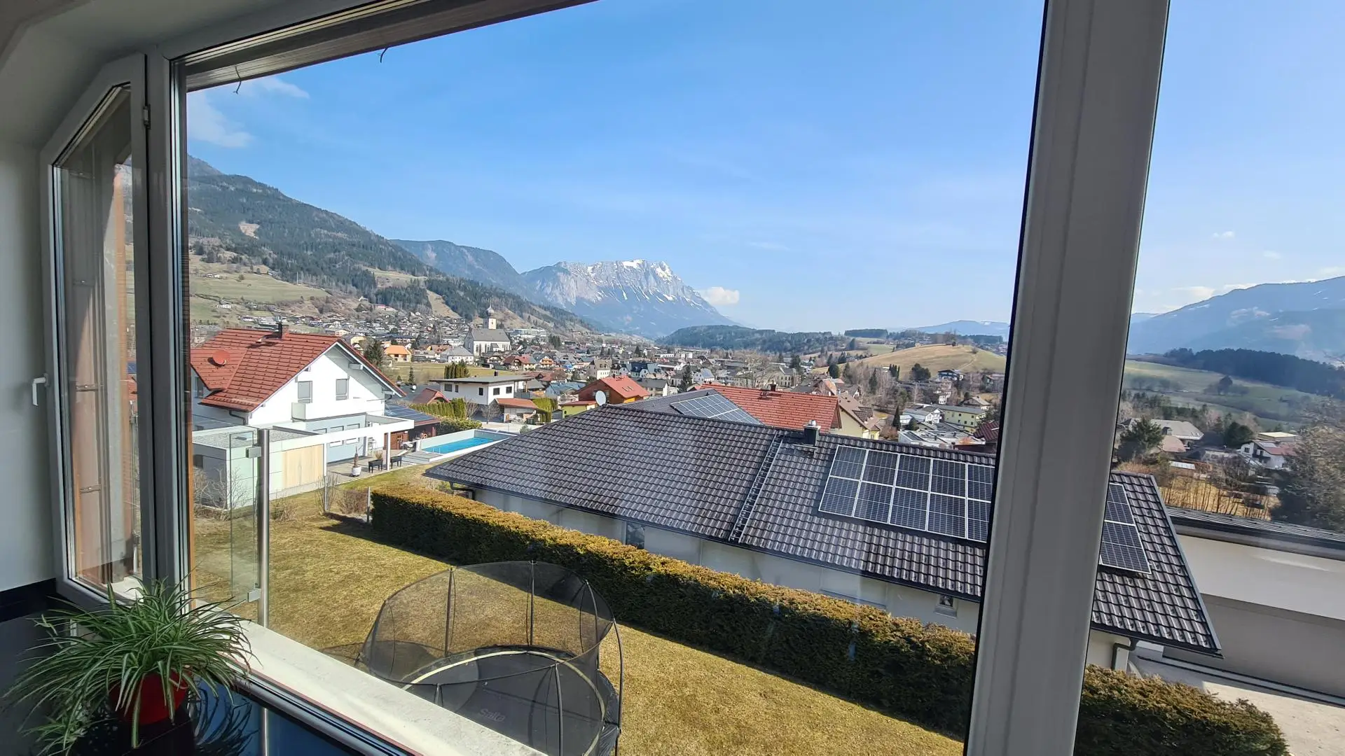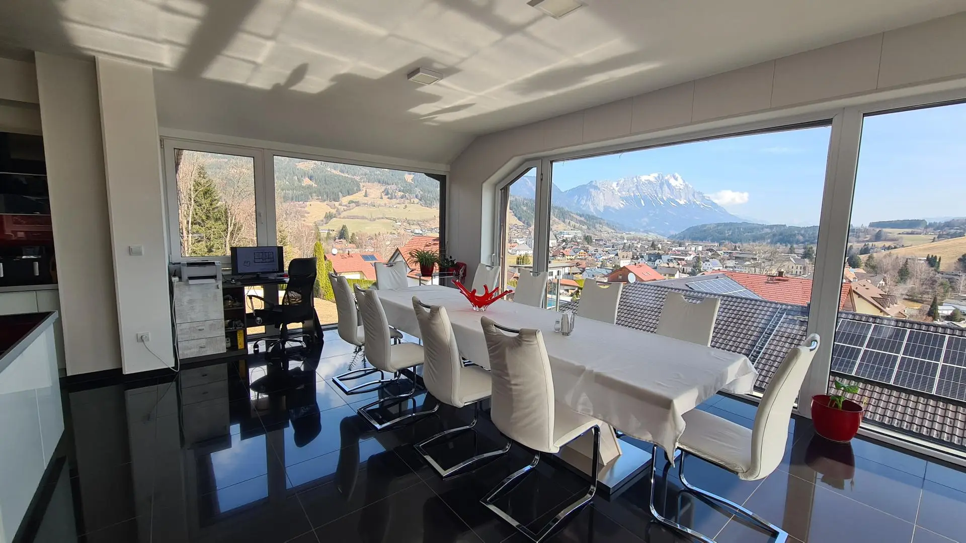 Bereits beim Betreten der Wohnung wird der offene und lichtdurchflutete Charakter spürbar. Der großzügige Wohn- und Essbereich bildet das Herzstück der Immobilie. Große Fensterflächen sorgen nicht nur für eine angenehme Helligkeit im gesamten Wohnraum, sondern eröffnen auch einen spektakulären 180-Grad-Panoramablick über Gröbming und die umliegende Landschaft. Die Kombination aus moderner Architektur und dieser einzigartigen Aussicht schafft eine besondere Wohnatmosphäre.