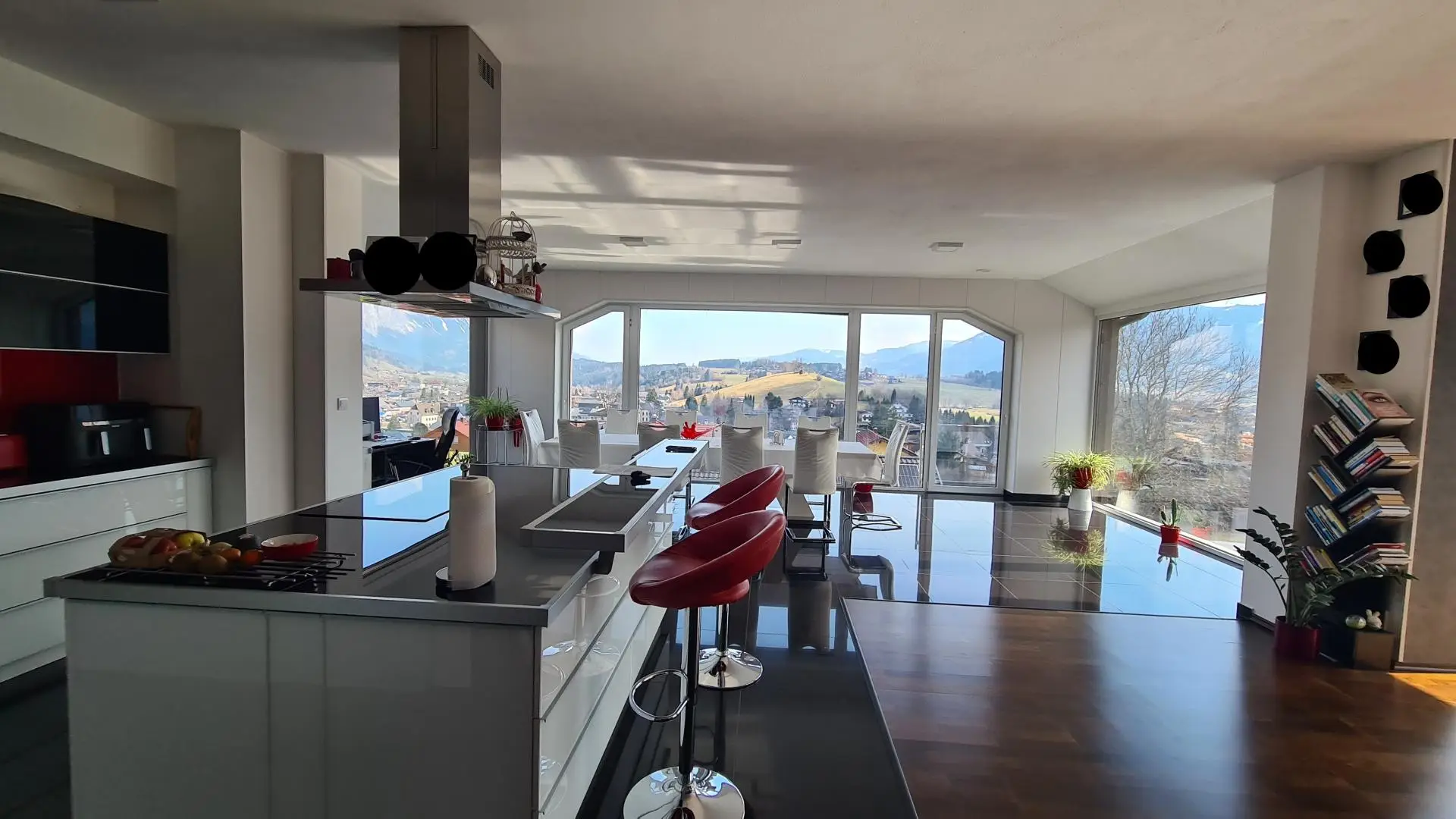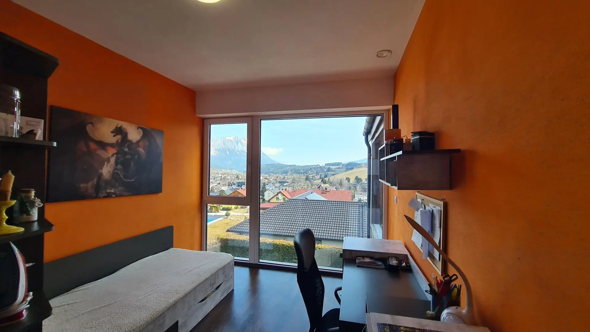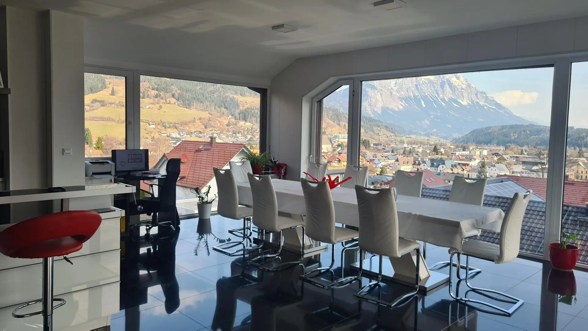 Bereits beim Betreten der Wohnung wird der offene und lichtdurchflutete Charakter spürbar. Der großzügige Wohn- und Essbereich bildet das Herzstück der Immobilie. Große Fensterflächen sorgen nicht nur für eine angenehme Helligkeit im gesamten Wohnraum, sondern eröffnen auch einen spektakulären 180-Grad-Panoramablick über Gröbming und die umliegende Landschaft. Die Kombination aus moderner Architektur und dieser einzigartigen Aussicht schafft eine besondere Wohnatmosphäre.