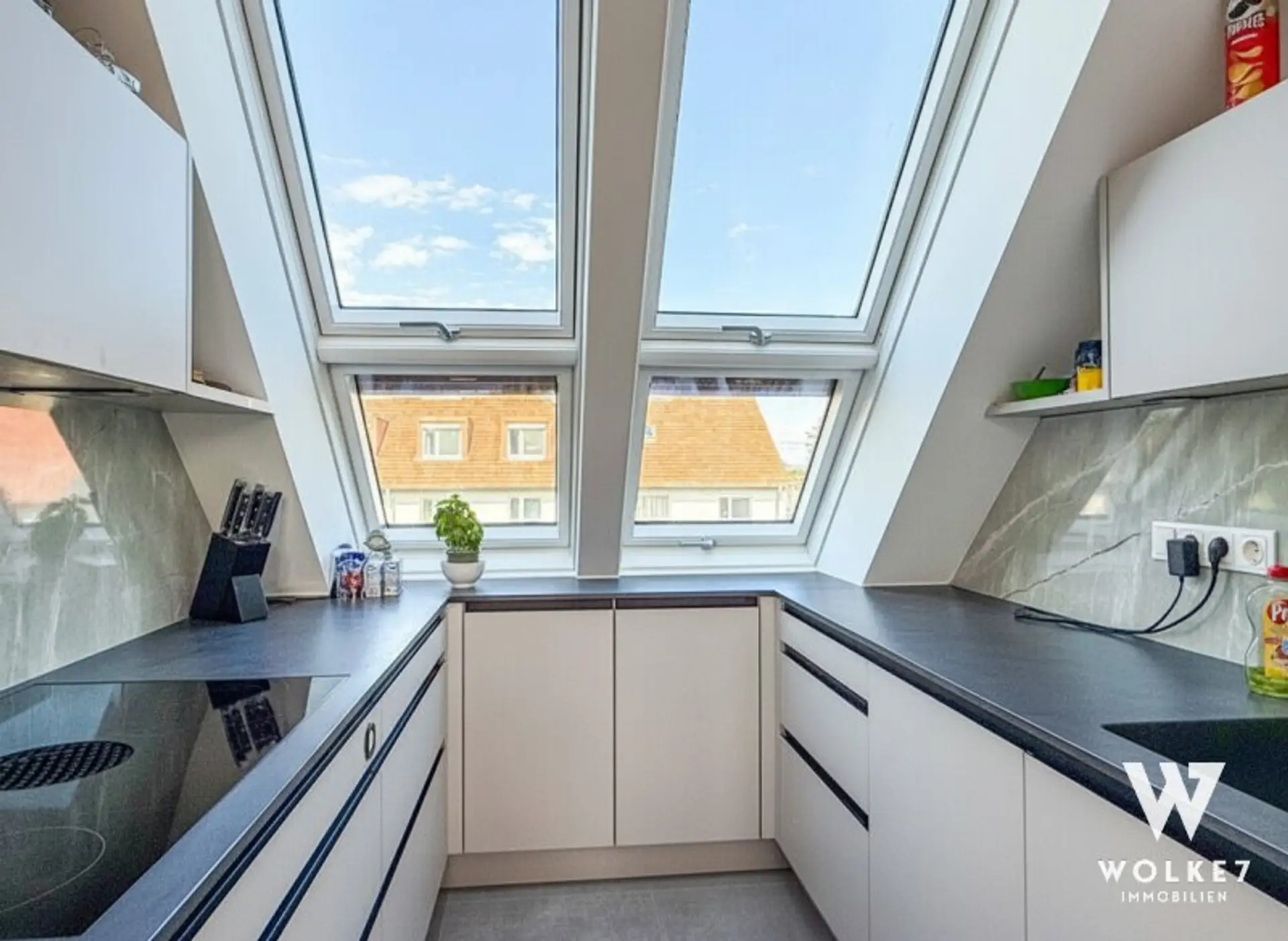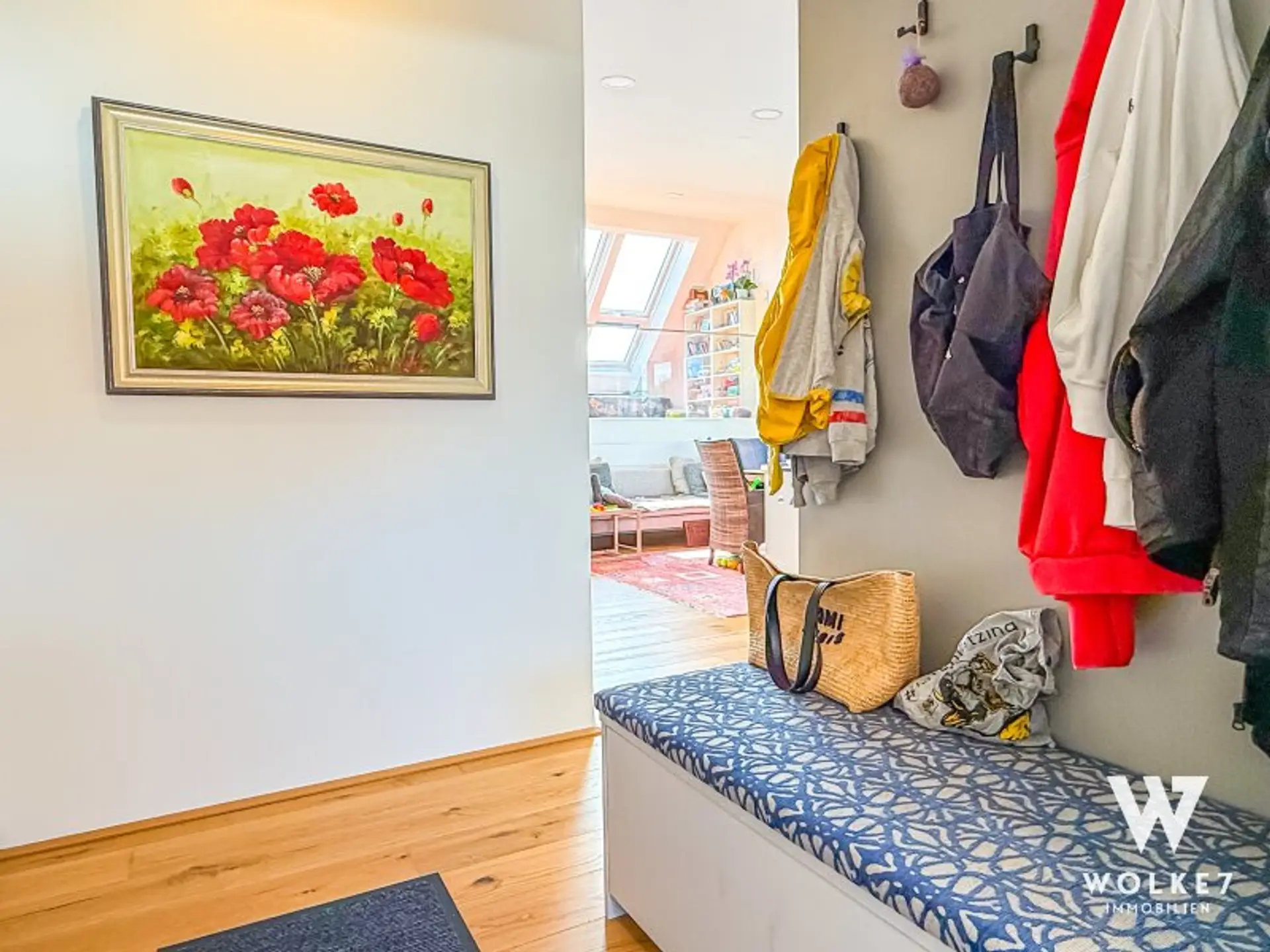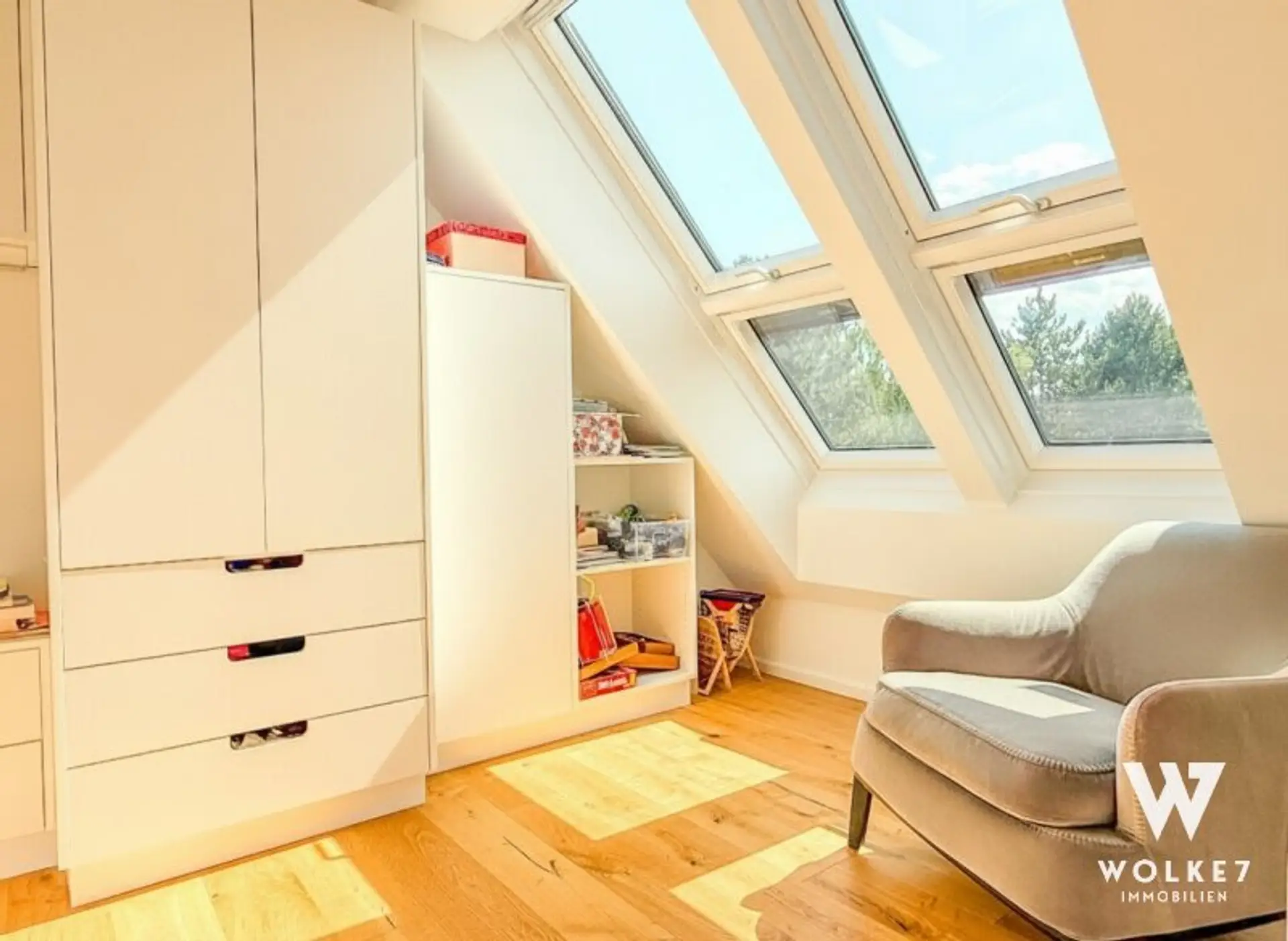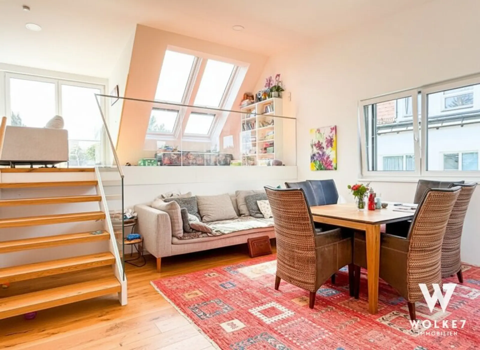 Durch die erhöhte Zwischenebene sind zwei weitere geschmackvolle Zimmer sowie ein hochwertig ausgestattetes Bad mit elektrischem Dachfenster erreichbar. Die durchdachte Architektur mit unterschiedlichen Ebenen schafft eine besondere Wohnatmosphäre: offen, hell und zugleich elegant gegliedert – ideal, um repräsentatives Wohnen und private Rückzugsorte zu vereinen.