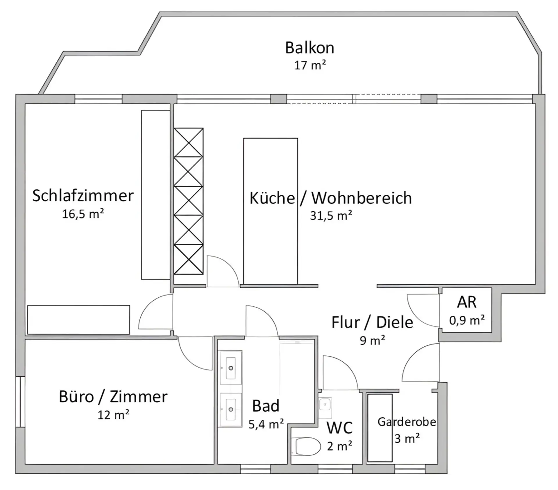 Wohnraum mit möblierte Küche und 17 m² großer Balkon