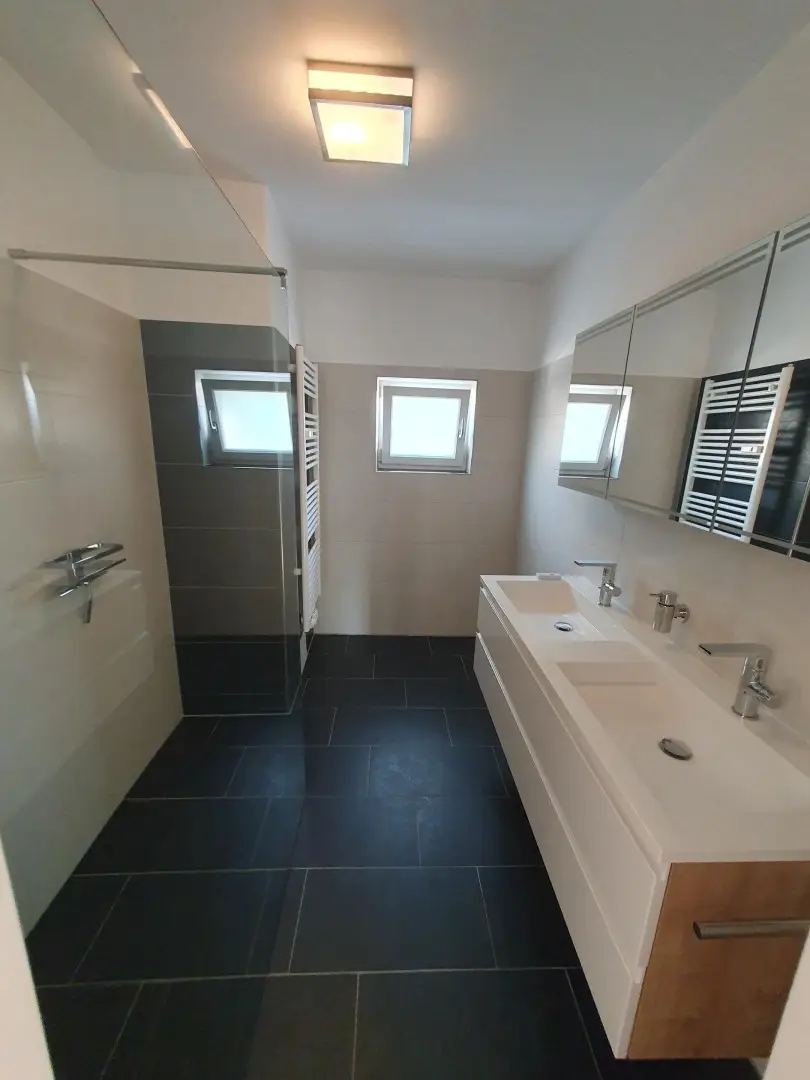 Bad mit Dusche, Doppelwaschbecken, Waschmaschinenschluss und Fenster