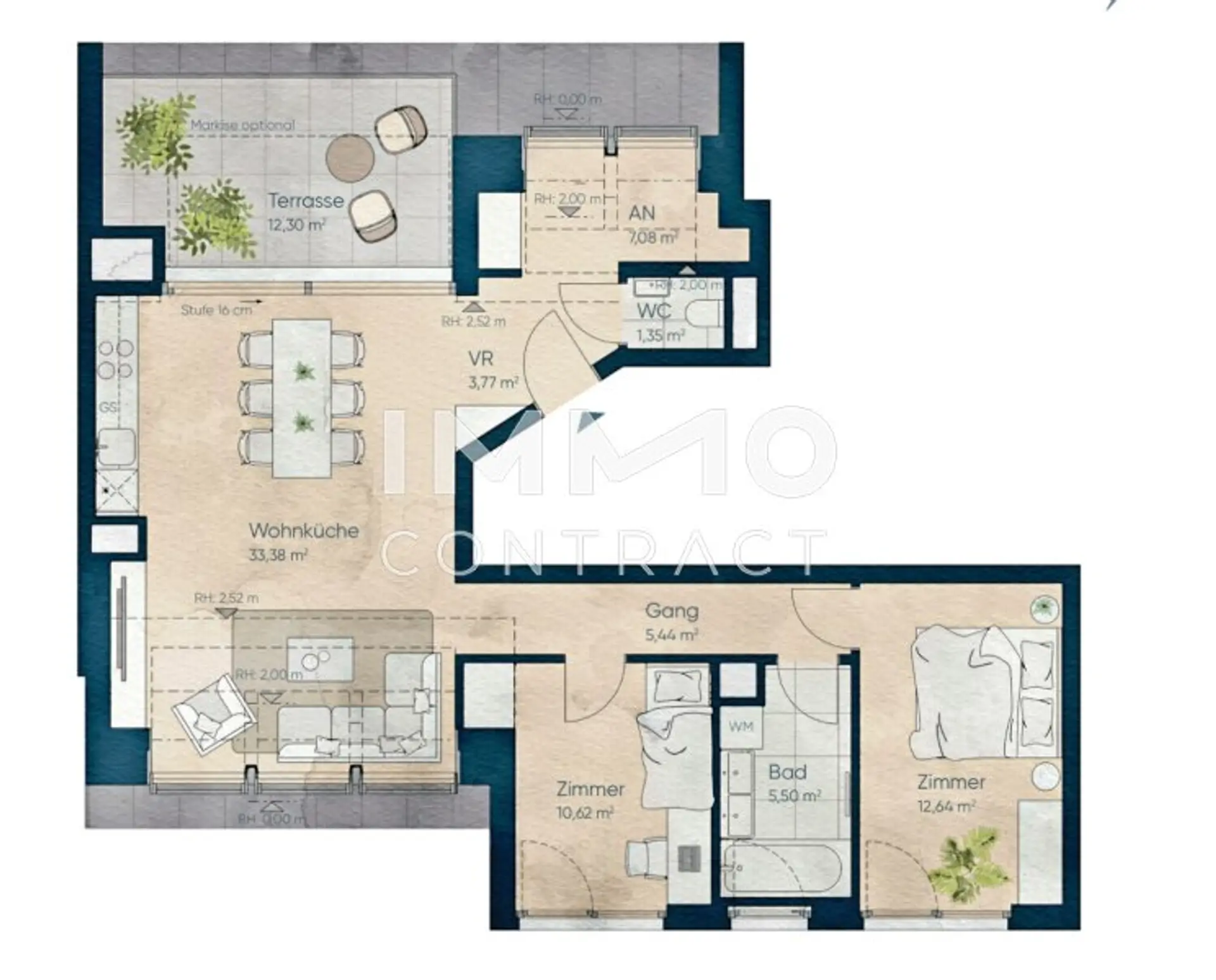 Die offene Wohnküche bildet das Herzstück der Wohnung und schafft Raum für Begegnung und Genuss. Zwei weitere Zimmer bieten flexible Nutzungsmöglichkeiten – als Schlafzimmer, Büro oder Gästezimmer. Das Bad mit Wanne verspricht entspannte Momente, während ein separates Gäste-WC zusätzlichen Komfort bietet.