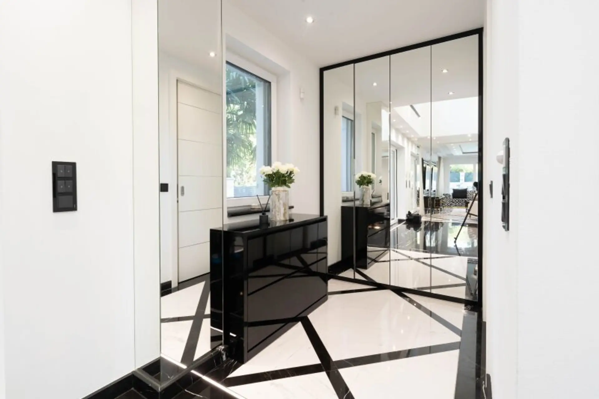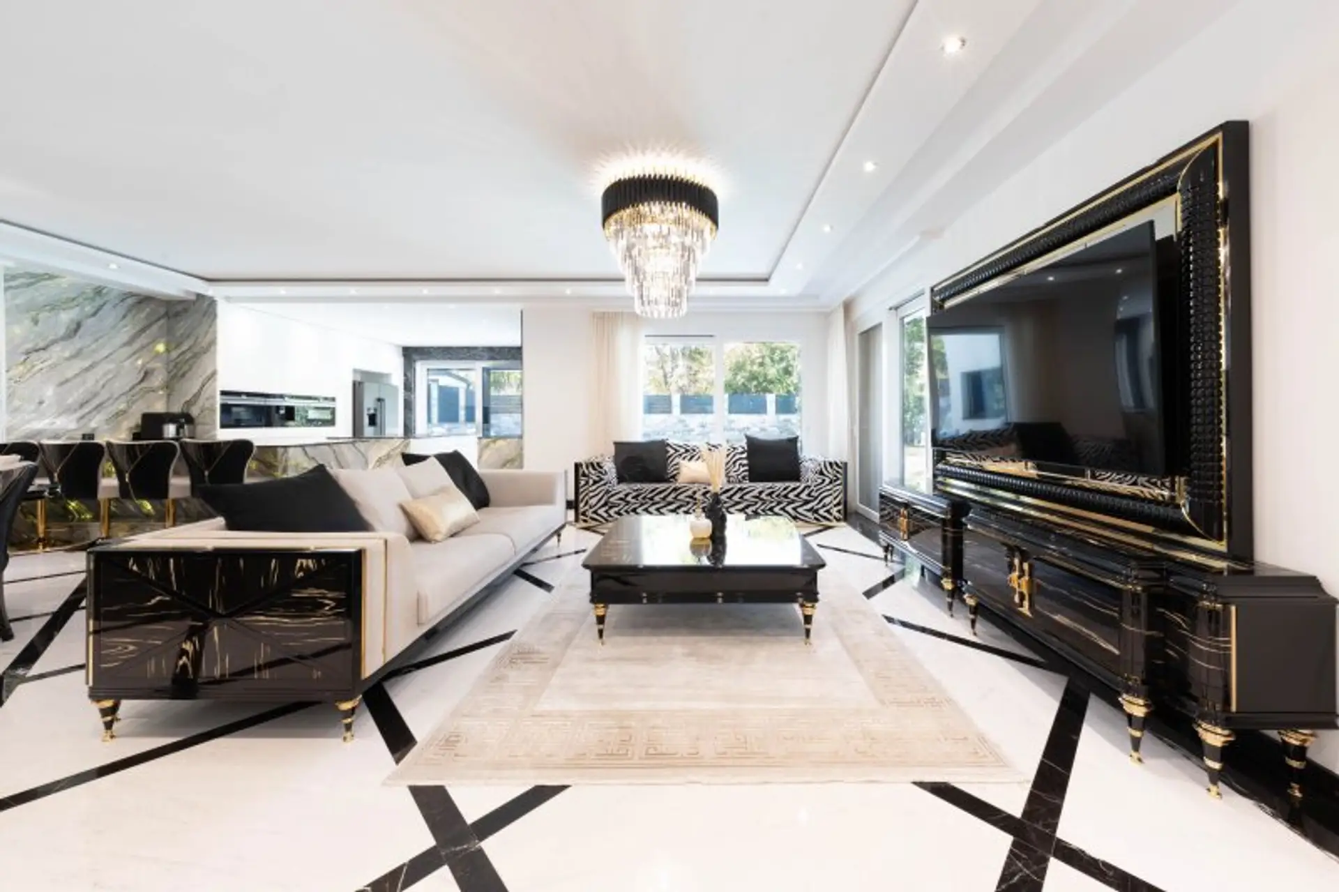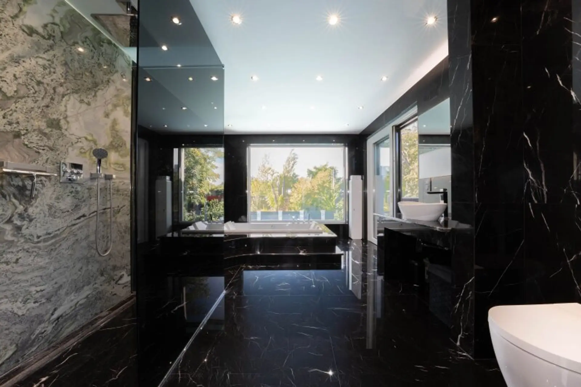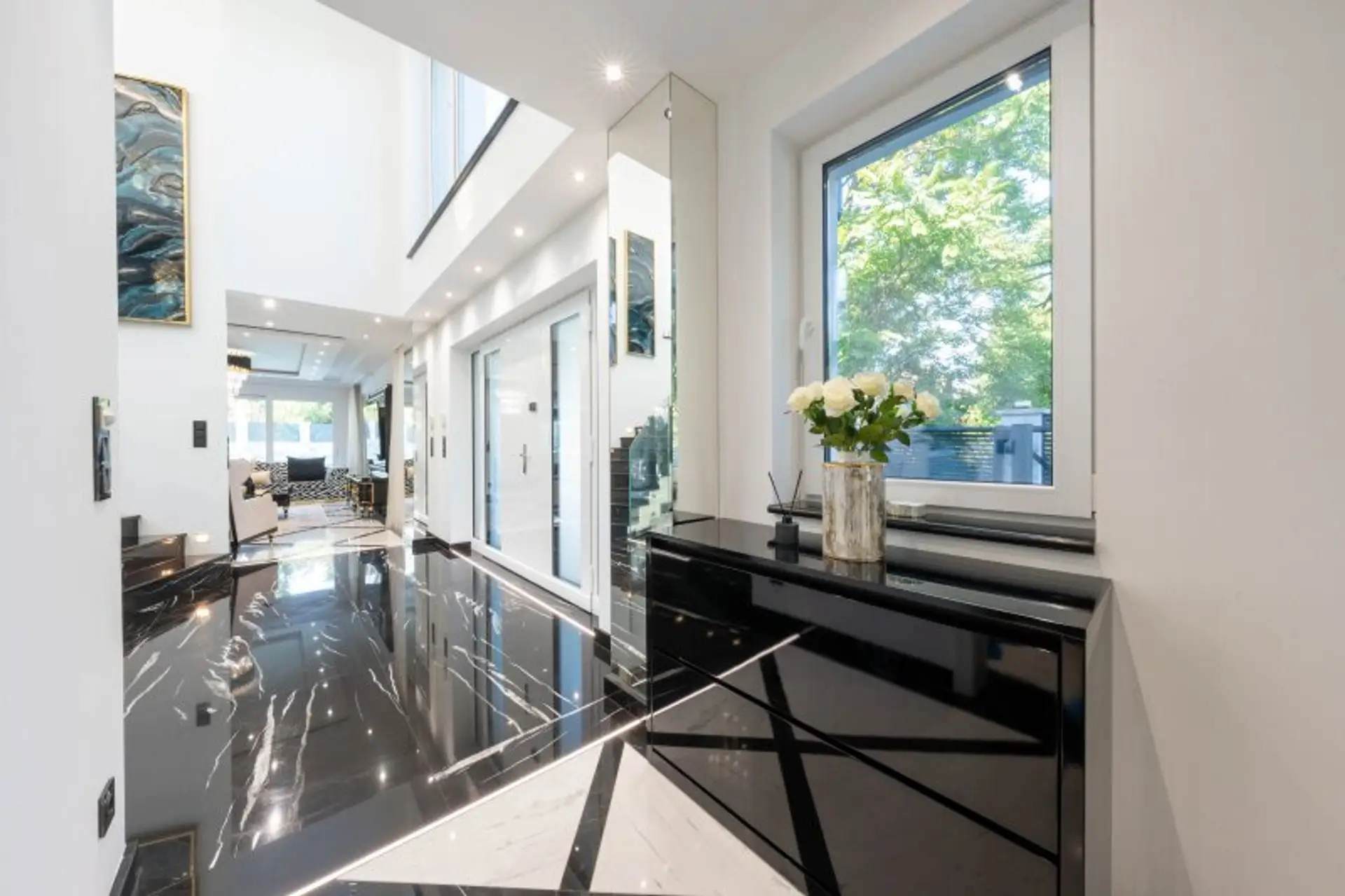 Die Ausstattung des Hauses lässt keine Wünsche offen. Naturstein- und Marmorböden schaffen ein harmonisches Gesamtbild. Das durchdachte Beleuchtungskonzept sowie hochwertige Armaturen in den Bädern unterstreichen den modernen Charakter der Villa. Große Glasfronten, helle Räume und eine elegante Linienführung verleihen dem Haus Leichtigkeit und Offenheit.