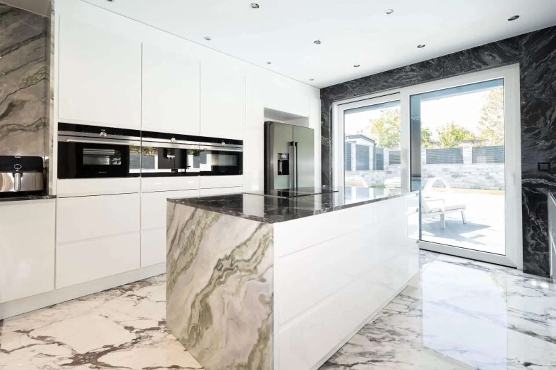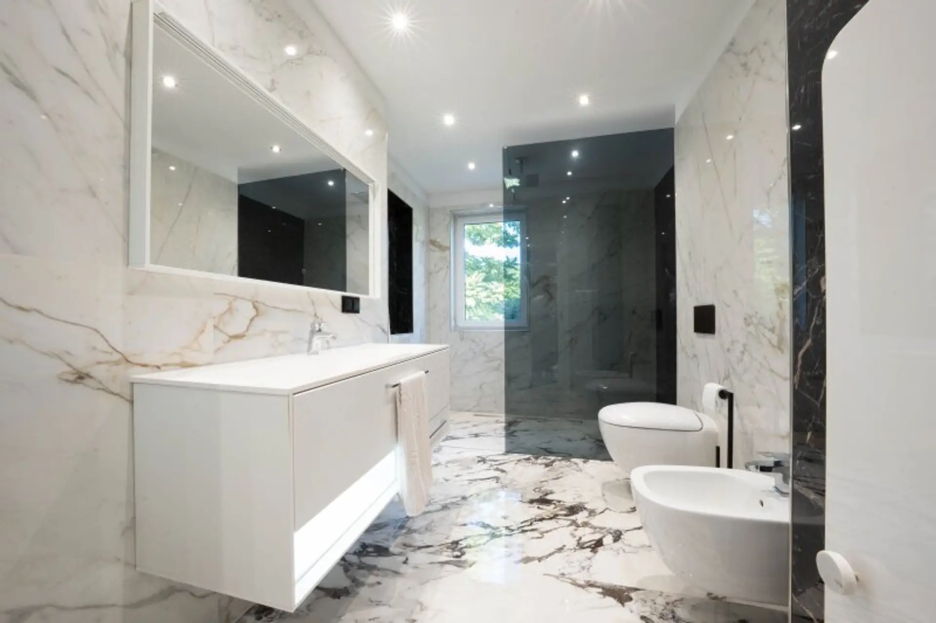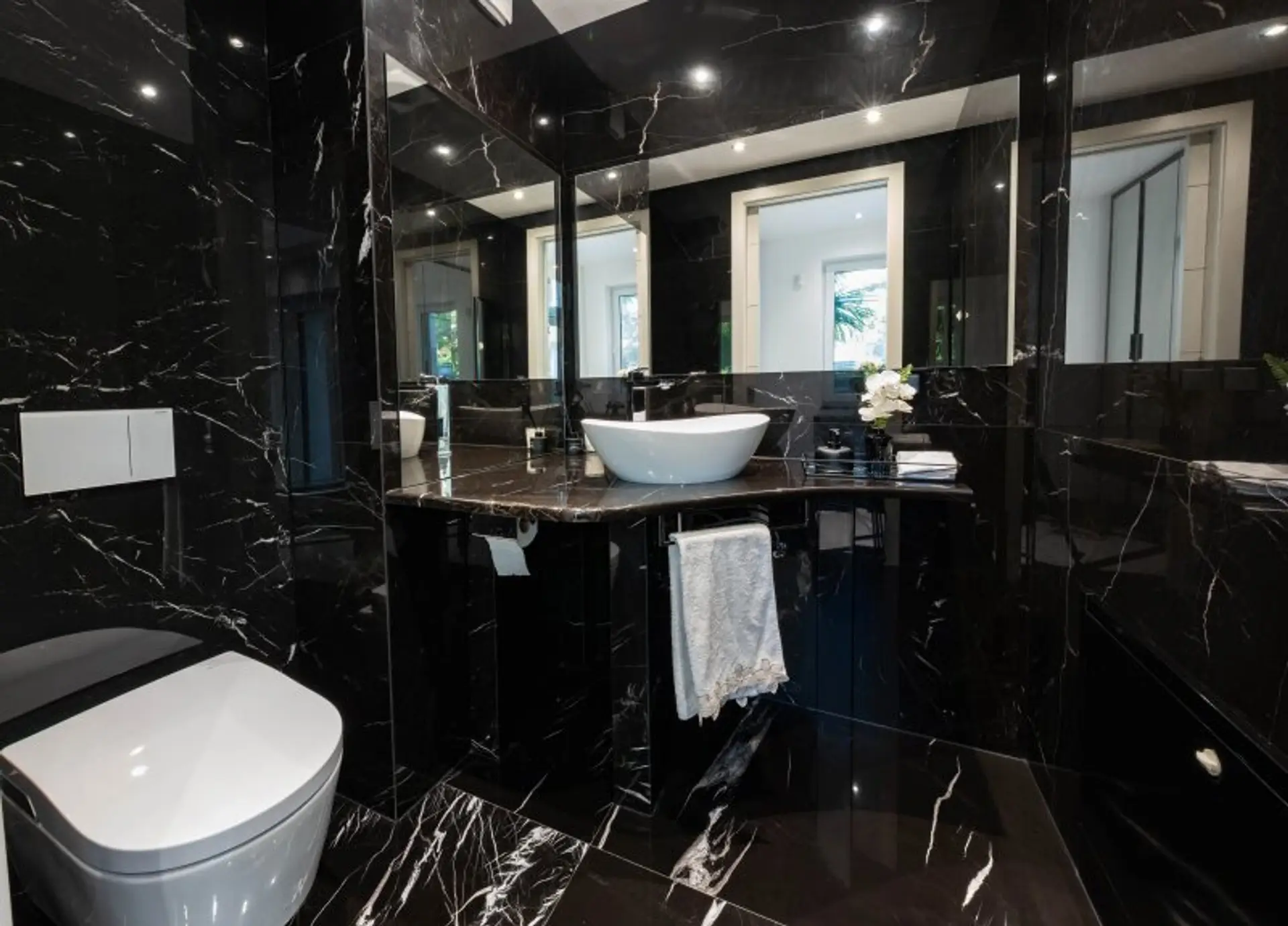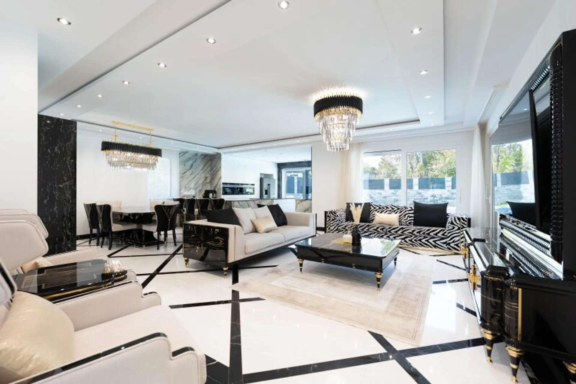 Die Ausstattung des Hauses lässt keine Wünsche offen. Naturstein- und Marmorböden schaffen ein harmonisches Gesamtbild. Das durchdachte Beleuchtungskonzept sowie hochwertige Armaturen in den Bädern unterstreichen den modernen Charakter der Villa. Große Glasfronten, helle Räume und eine elegante Linienführung verleihen dem Haus Leichtigkeit und Offenheit.
