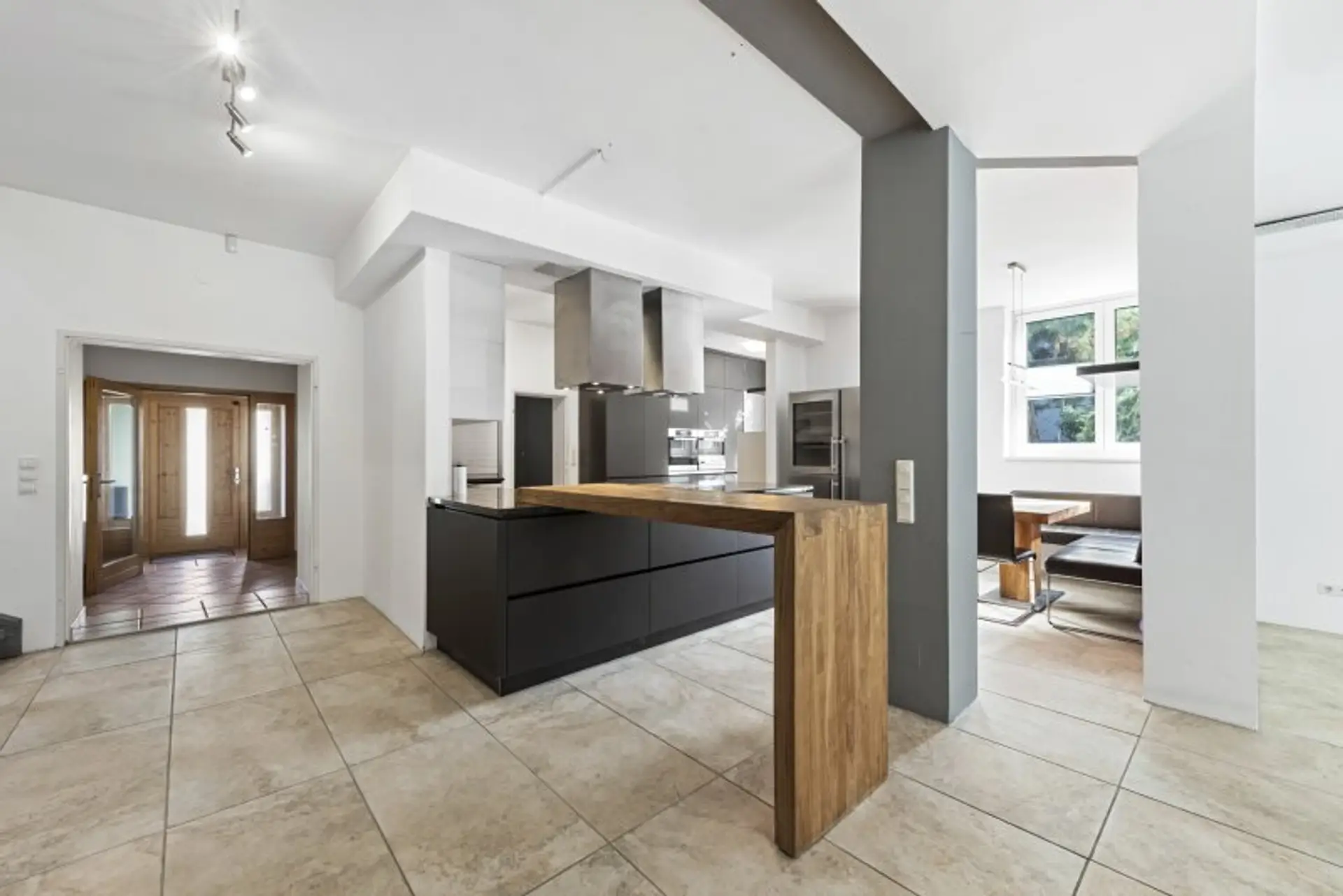 Großzügiger Wohn- und Essbereich mit offener Designküche und Kamin