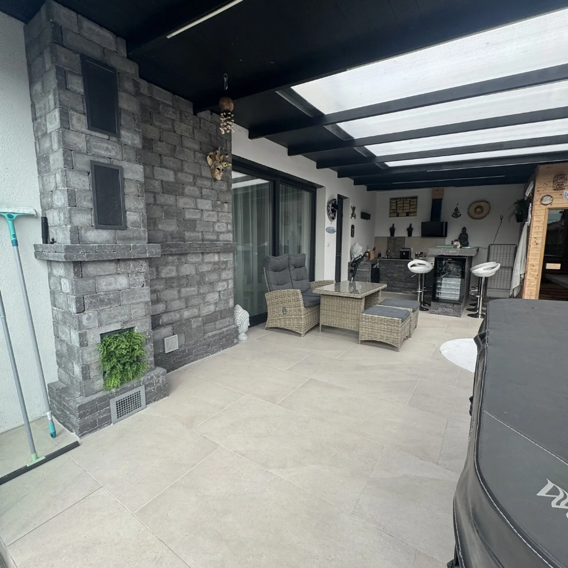 Der gepflegte Garten, kombiniert mit einer überdachten Outdoor-Küche, macht dieses Anwesen perfekt für entspannte Abende und repräsentative Anlässe.