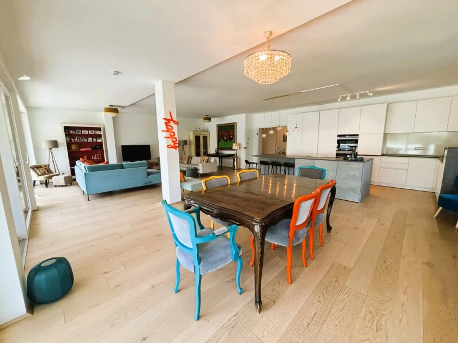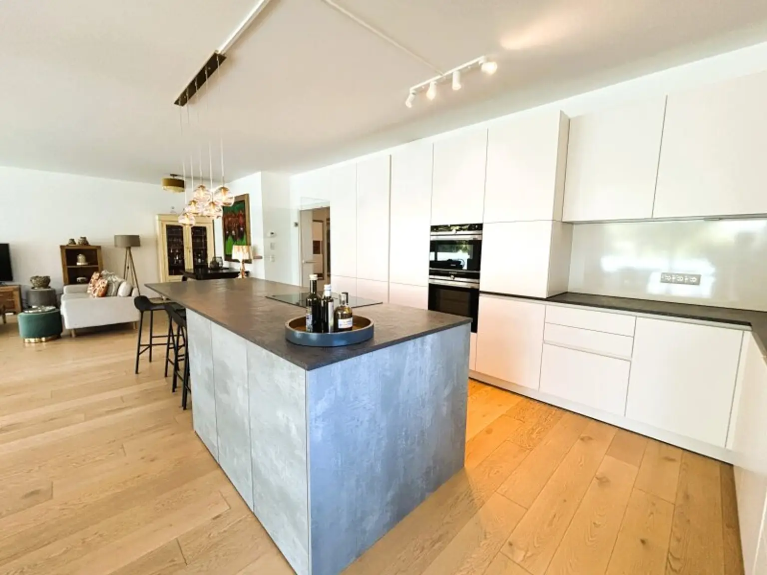 * Offene Wohnküche mit ca. 79,18 m², ausgestattet mit einer exklusiven Designerküche und hochwertigen Markengeräten