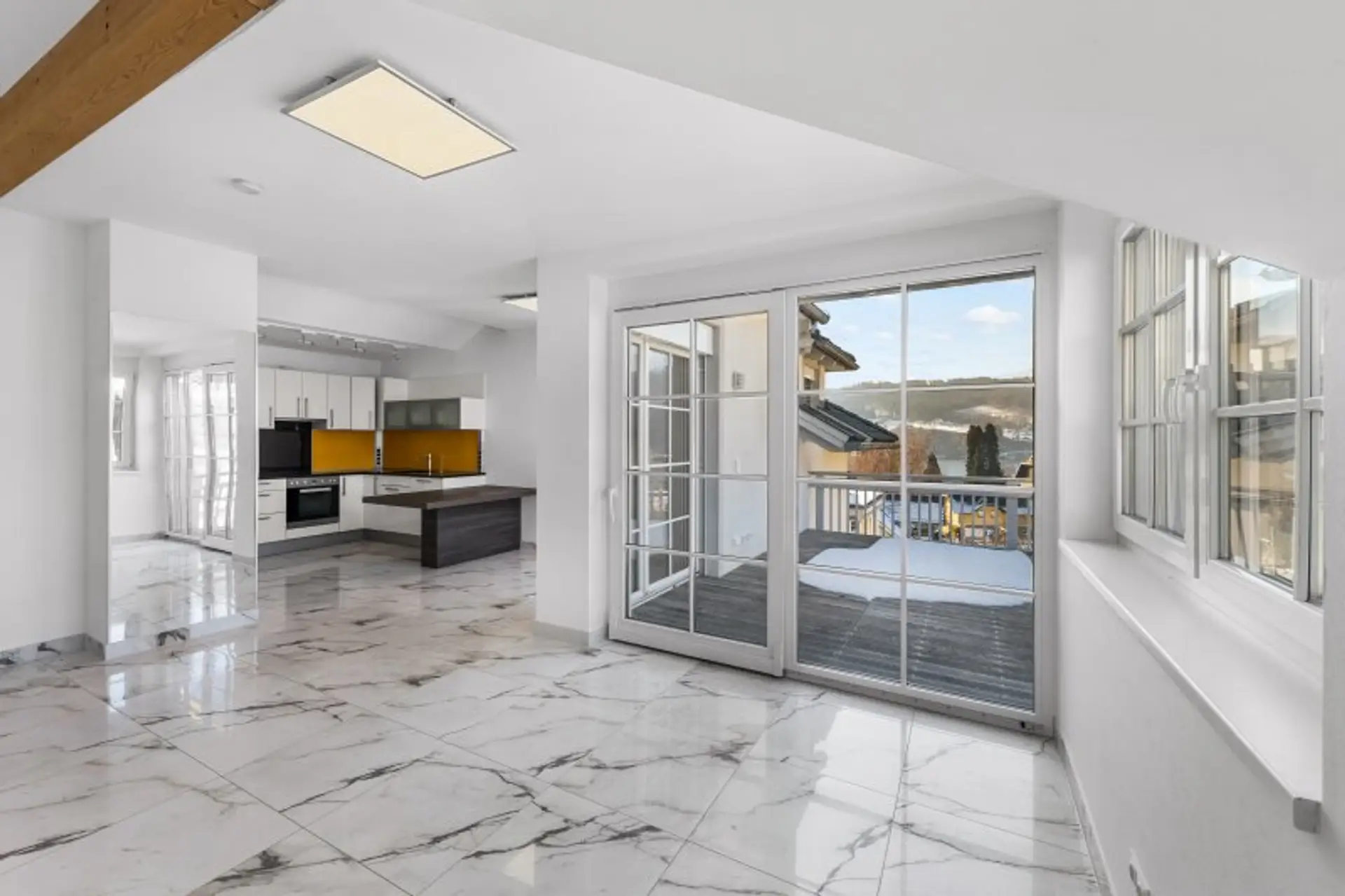 Eine sehr gute Raumaufteilung, die großzügige Terrasse mit Blick auf den See und ins Bergpanorama, und die Parkmöglichkeit am eigenen Tiefgaragenplatz (dieser ist mit einem Preis von € 15.000,- mitzukaufen) garantieren eine bequeme Nutzung dieser Wohnung. Die Versorgung mit Fernwärmeenergie und eine Bodenheizung in allen Räumen schließt sich nahtlos an diese Bequemlichkeit an.
