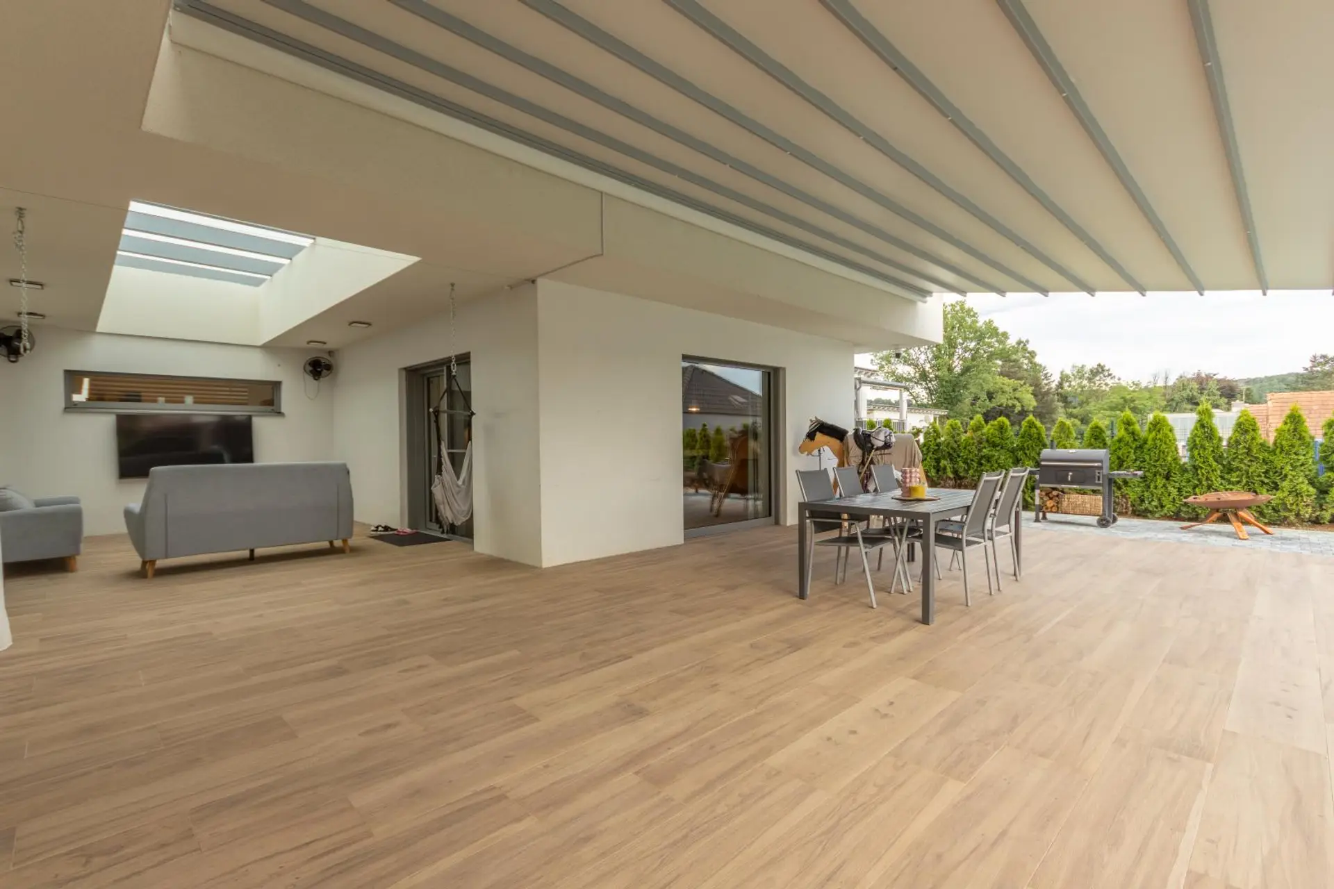 Im Außenbereich lädt eine beeindruckende, ca. 110 m² große Terrasse mit Pool zum Entspannen und Genießen ein. Ein echtes Highlight für warme Sommertage!
