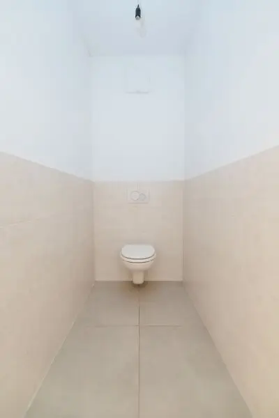 Zeitlos schöne Fliesen, bodenebene Dusche, Waschbecken, Waschmaschinenanschluss – das separate WC mit Fenster sorgt für zusätzlichen Komfort.