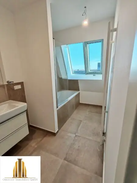In der ersten Wohnebene befindet sich ein großzügiger Vorraum, ein Zimmer mit Schrankraum, Ein Masterbedroom mit Traumaussicht auf die umliegende Dachlandschaft, ein weiters Zimmer (Kinderzimmer), eine Küche mit Essbereich und ein elegantes Badezimmer mit Badewanne, Dusche, WC.